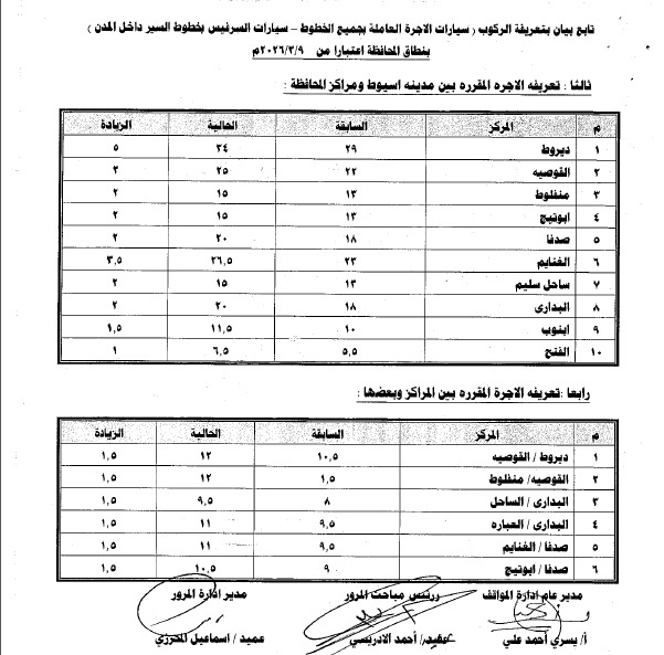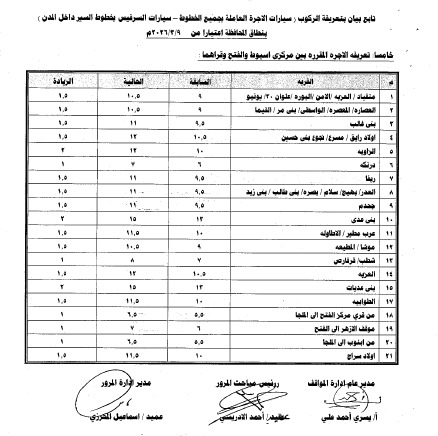 كما شمل القرار تعديل تعريفة الأجرة بين أسيوط والمحافظات الأخرى، حيث بلغت 275 جنيهًا إلى القاهرة، و46 جنيها لملوي، و65 للمنيا، و24.5 لطما و38 لطهطا و61 لسوهاج، و60 للمراغة و101 البلينا و98 لجرجا و101 لدار السلام،و115 للوادي الجديد و125 لنجع حمادي، و127 جنيها لقنا و265 جنيهًا للغردقة، إلى جانب باقي الأسعار التي تم تحديدها وفق المسافات المعتمدة رسميًا.