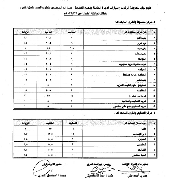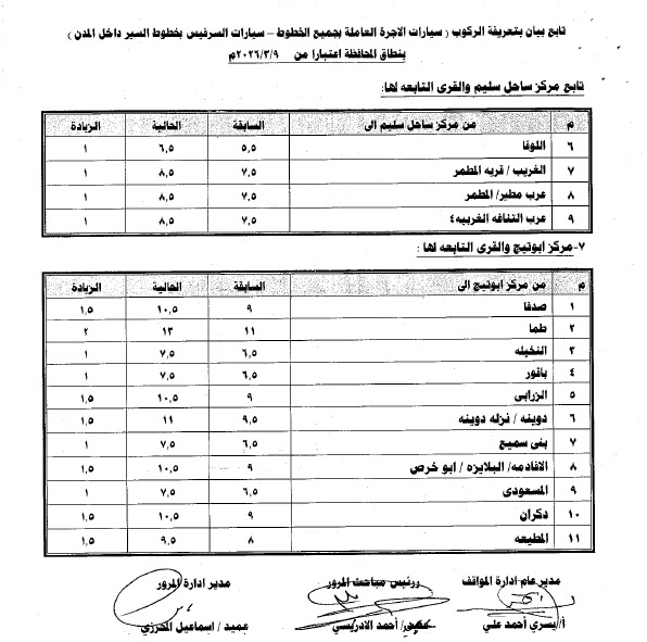 أصدر اللواء محمد علوان، محافظ أسيوط، قرارا رقم 474 لسنة 2026 بالتعريفة الجديدة لأجرة المواصلات الداخلية والخارجية بمختلف وسائل النقل الجماعي والسرفيس والتاكسي داخل مدن ومراكز المحافظة، وذلك عقب قرار لجنة التسعير التلقائي للمنتجات البترولية بتحريك أسعار البنزين والسولار ويأتي ذلك في ضوء الوضع الاستثنائي الناتج عن التطورات الجيوسياسية في منطقة الشرق الأوسط وتأثيراتها المباشرة على أسواق الطاقة العالمية، والتي أدت إلي ارتفاع كبير في تكلفة الاستيراد والإنتاج المحلي،