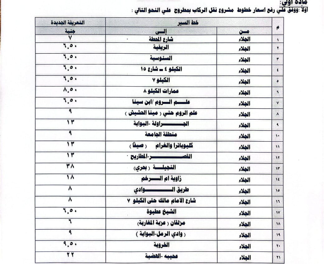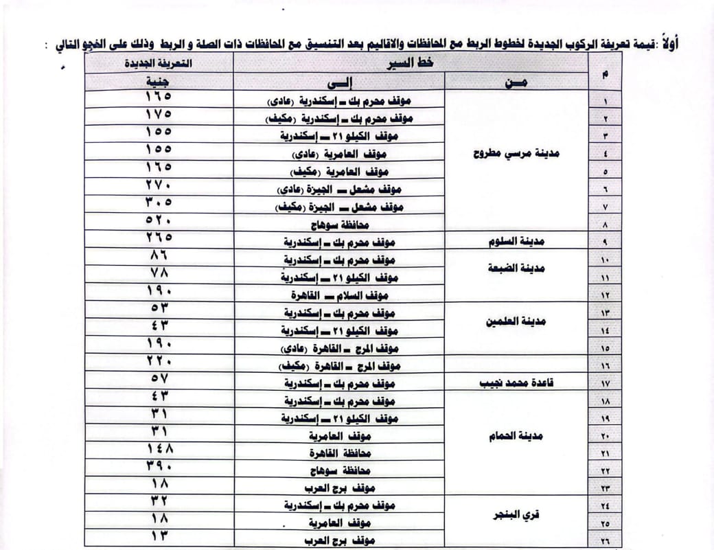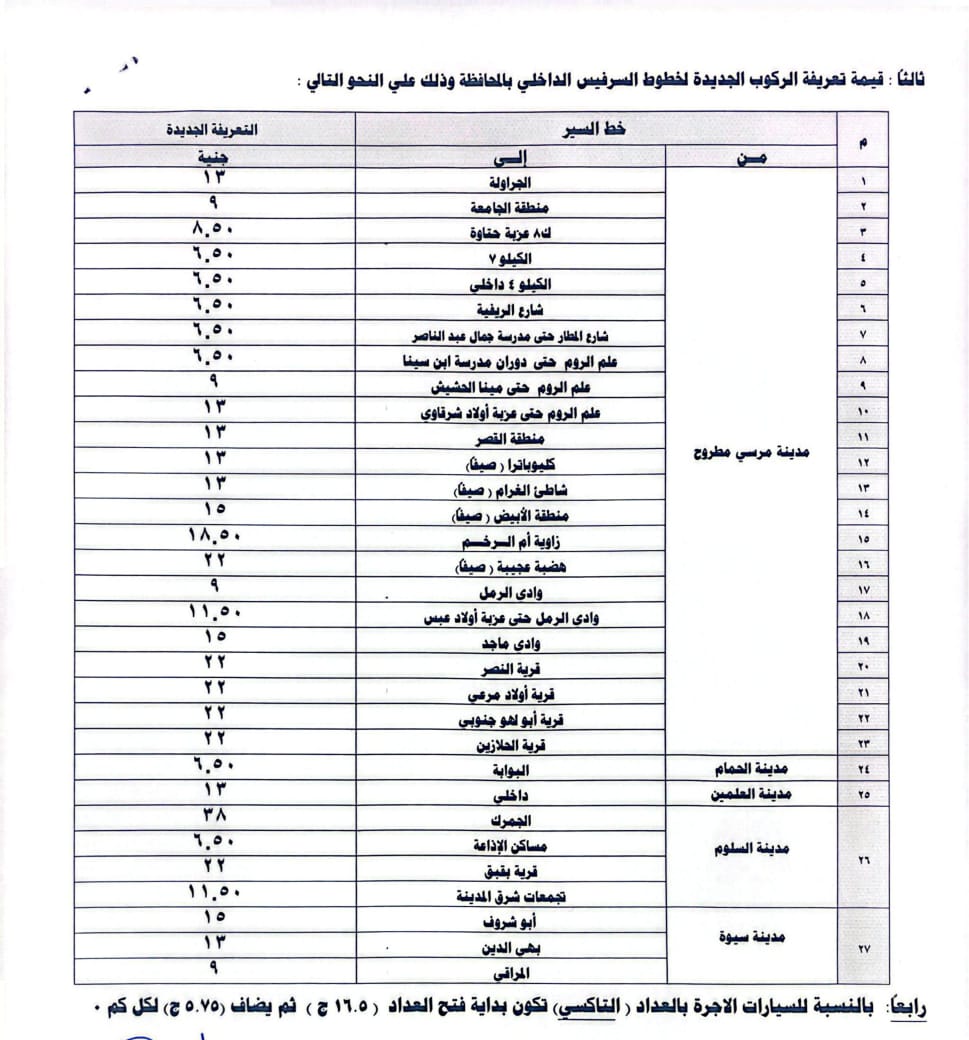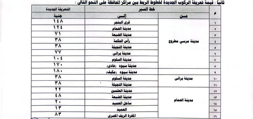 قرر اللواء محافظ مطروح تعديل تعريفة الاجرة الحالية على جميع المواصلات العامة بالخطوط الداخلية والخارجية ومشروع اتوبيس النقل الداخلى بالمحافظة.