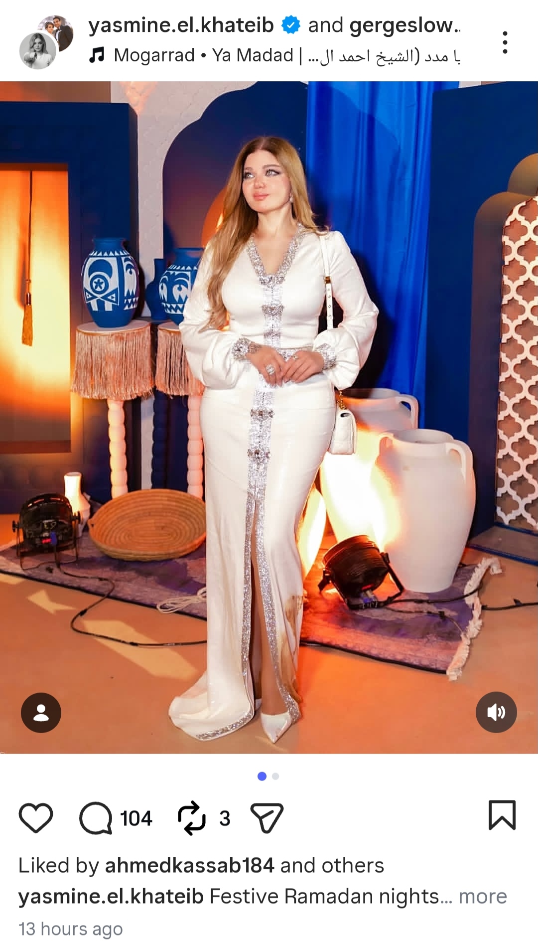 وانتعلت ياسمين الخطيب حذاء أنيقا ذا كعب عال باللون الأبيض، وتزينت ببعض الإكسسوارات التي منحتها إطلالة متكاملة.