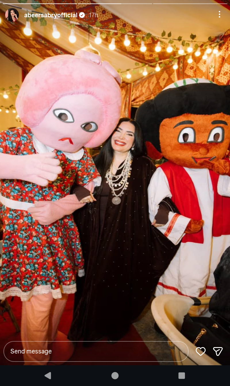 وظهرت عبير صبري في الصورة بإطلالة رمضانية رفقة المجسمان طمطم وبكار الشخصيات الكارتونية، نالت إعجاب متابعيها.