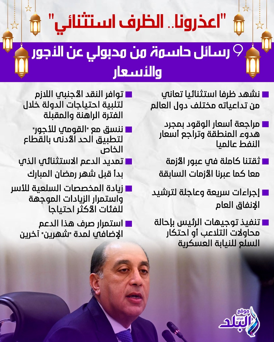 وحضر المُؤتمر الصحفي، بمقر الحكومة بالعاصمة الجديدة، كل من أحمد كجوك، وزير المالية، والدكتور شريف فاروق، وزير التموين والتجارة الداخلية، والدكتور بدر عبدالعاطي، وزير الخارجية والتعاون الدولي والمصريين في الخارج، والمهندس كريم بدوي، وزير البترول والثروة المعدنية، وضياء رشوان، وزير الدولة للإعلام، بهدف إيضاح الحقائق حول حزمة الإجراءات الاستثنائية "المؤقتة" التي اتخذتها الحكومة بهدف تعزيز قدرة الاقتصاد الوطني على التعامل مع التداعيات المترتبة على التطورات ذات الصلة بالتصعيد العسكري في المنطقة.
