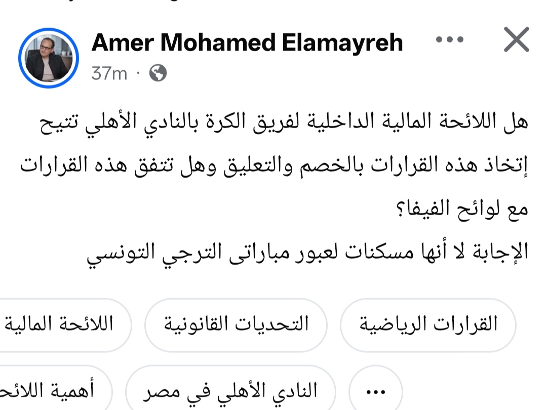 و كتب عامر العمايرة:هل اللائحة المالية الداخلية لفريق الكرة بالنادي الأهلي تتيح اتخاذ هذه القرارات بالخصم والتعليق وهل تتفق هذه القرارات مع لوائح الفيفا؟