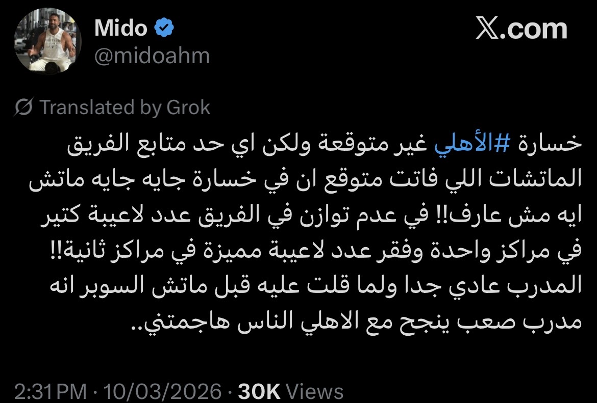 وكتب ميدو عبر حسابه على فيسبوك: “خسارة الأهلي غير متوقعة ولكن اي حد متابع الفريق الماتشات اللي فاتت متوقع ان في خسارة جايه جايه ماتش ايه مش عارف!! في عدم توازن في الفريق عدد لاعيبة كتير في مراكز واحدة وفقر عدد لاعيبة مميزة في مراكز ثانية!! المدرب عادي جدا ولما قلت عليه قبل ماتش السوبر انه مدرب صعب ينجح مع الاهلي الناس هاجمتني”.