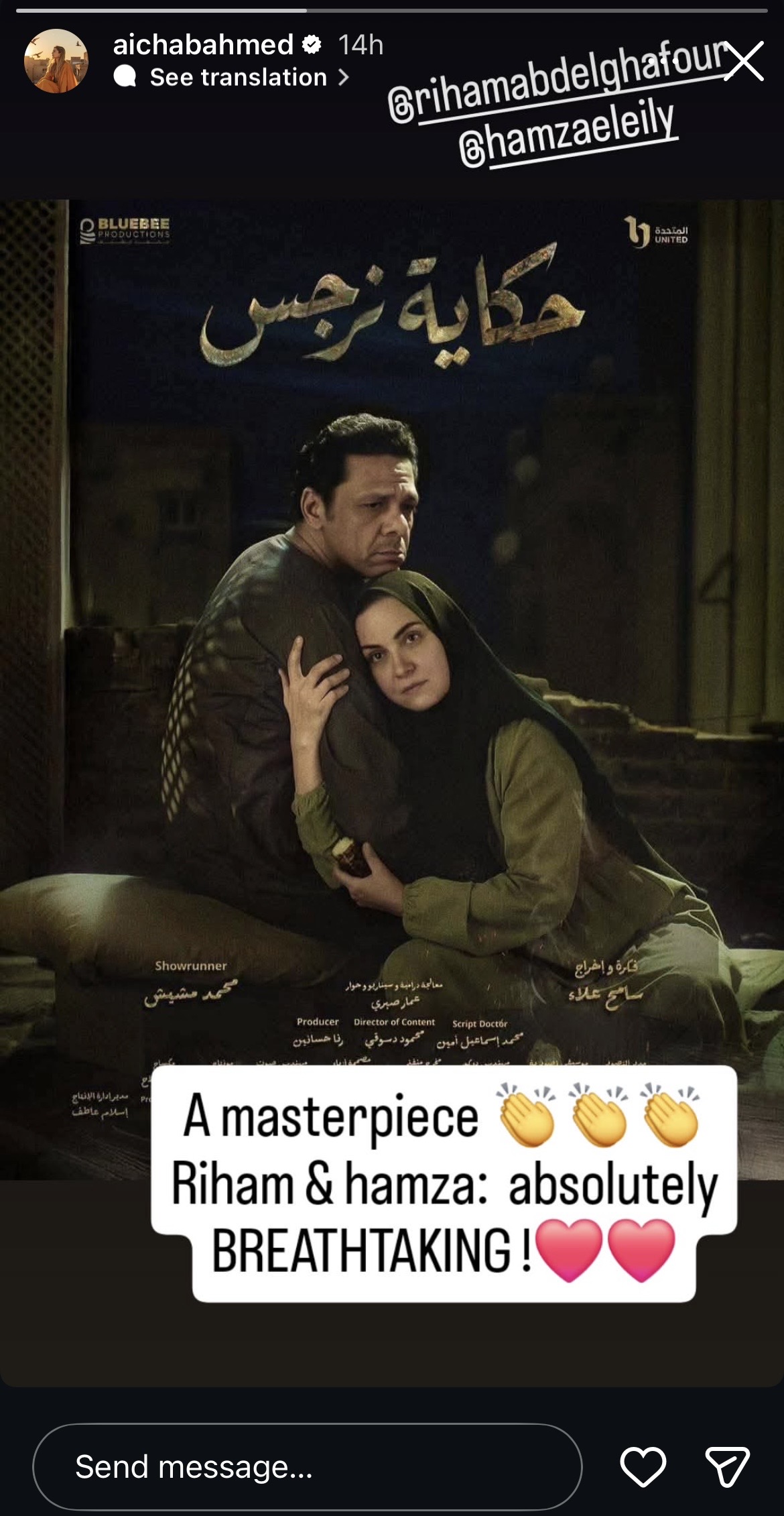 وأشادت الفنانة عائشة بن أحمد بأداء الفنانة ريهام عبد الغفور وحمزة العيلي في مسلسل “حكاية نرجس” عبر حسابها على انستجرام.