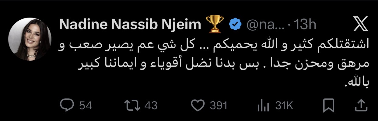 حرصت الفنانة نادين نسيب نجيم على توجيه رسالة مؤثرة لجمهورها عبر حسابها الشخصي على منصة إكس، عبّرت خلالها عن اشتياقها لهم في ظل الظروف الصعبة التي تمر بها البلاد.