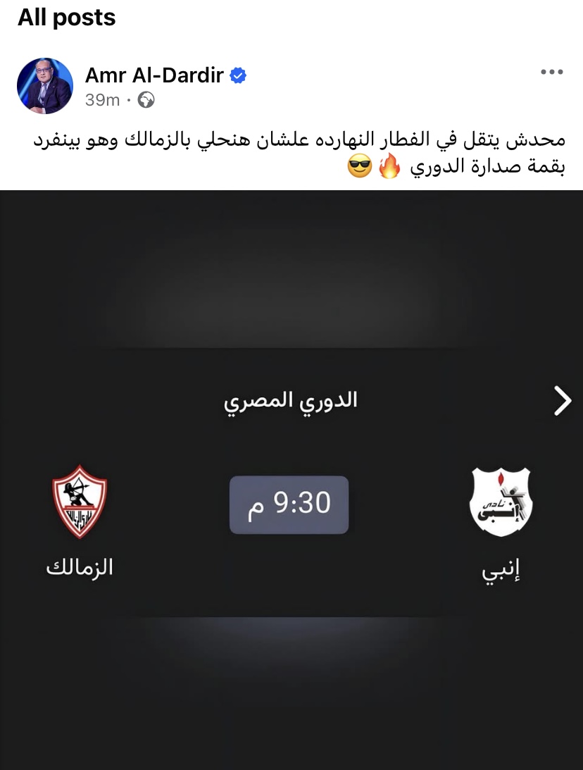 وكتب عمرو الدردير عبر حسابه علي موقع التواصل الإجتماعي فيسبوك:"محدش يتقل في الفطار النهارده علشان هنحلي بالزمالك وهو بينفرد بقمة صدارة الدوري".
