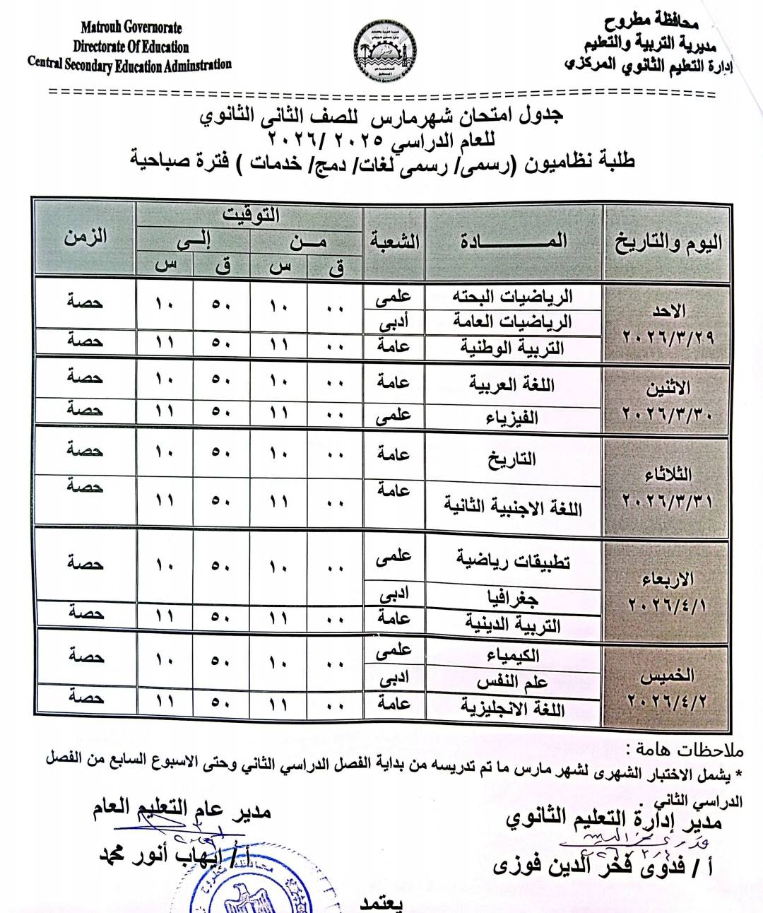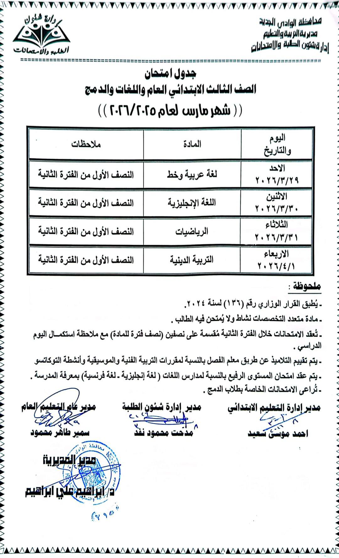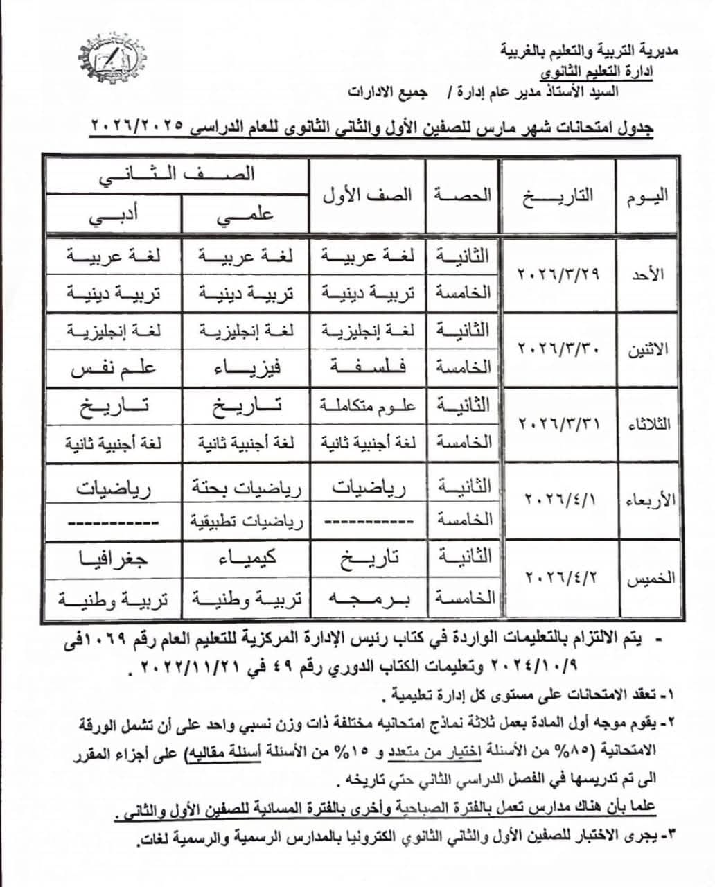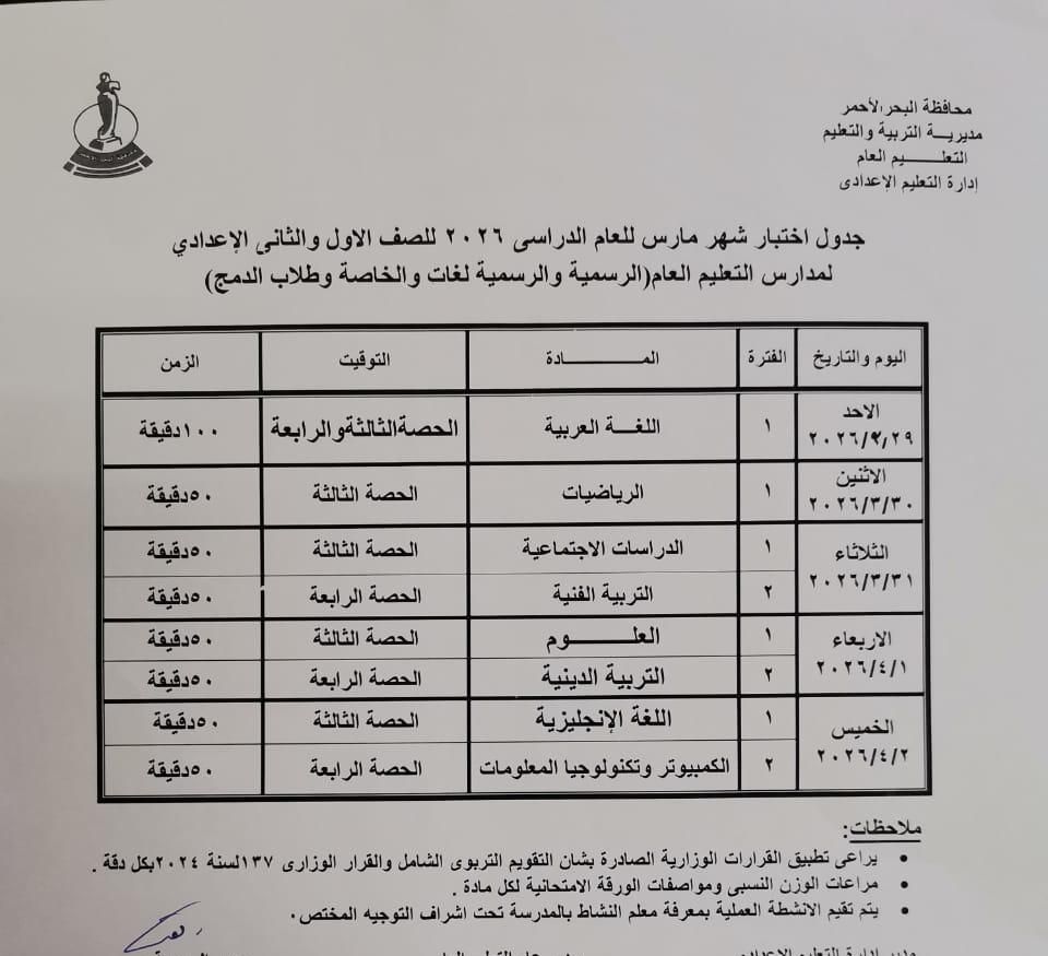 - يتم اداء امتحانات شهر مارس 2026 خلال اليوم الدراسي ويتم استكمال باقي اليوم الدراس بشكل طبيعي وفقا لجدول المدرسة
