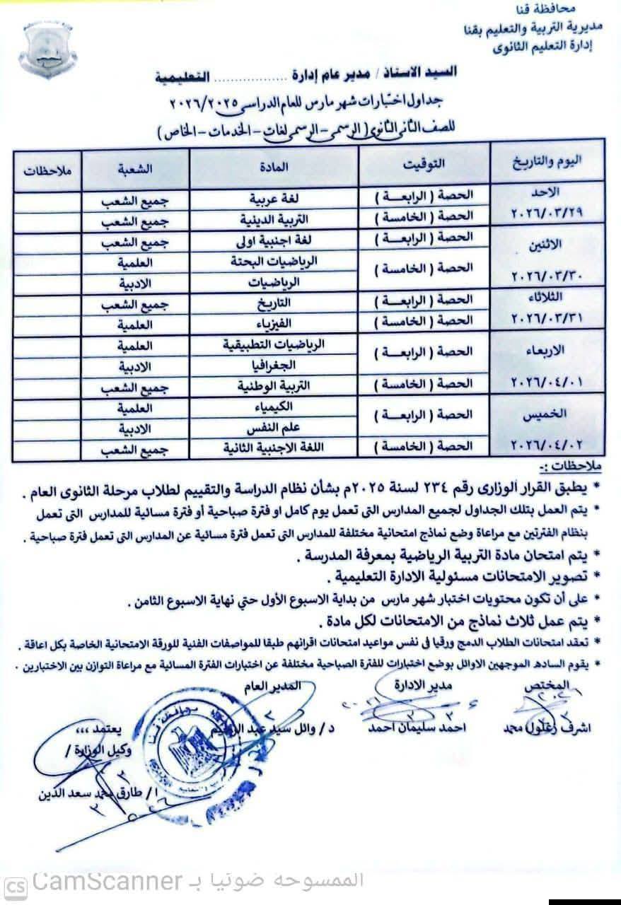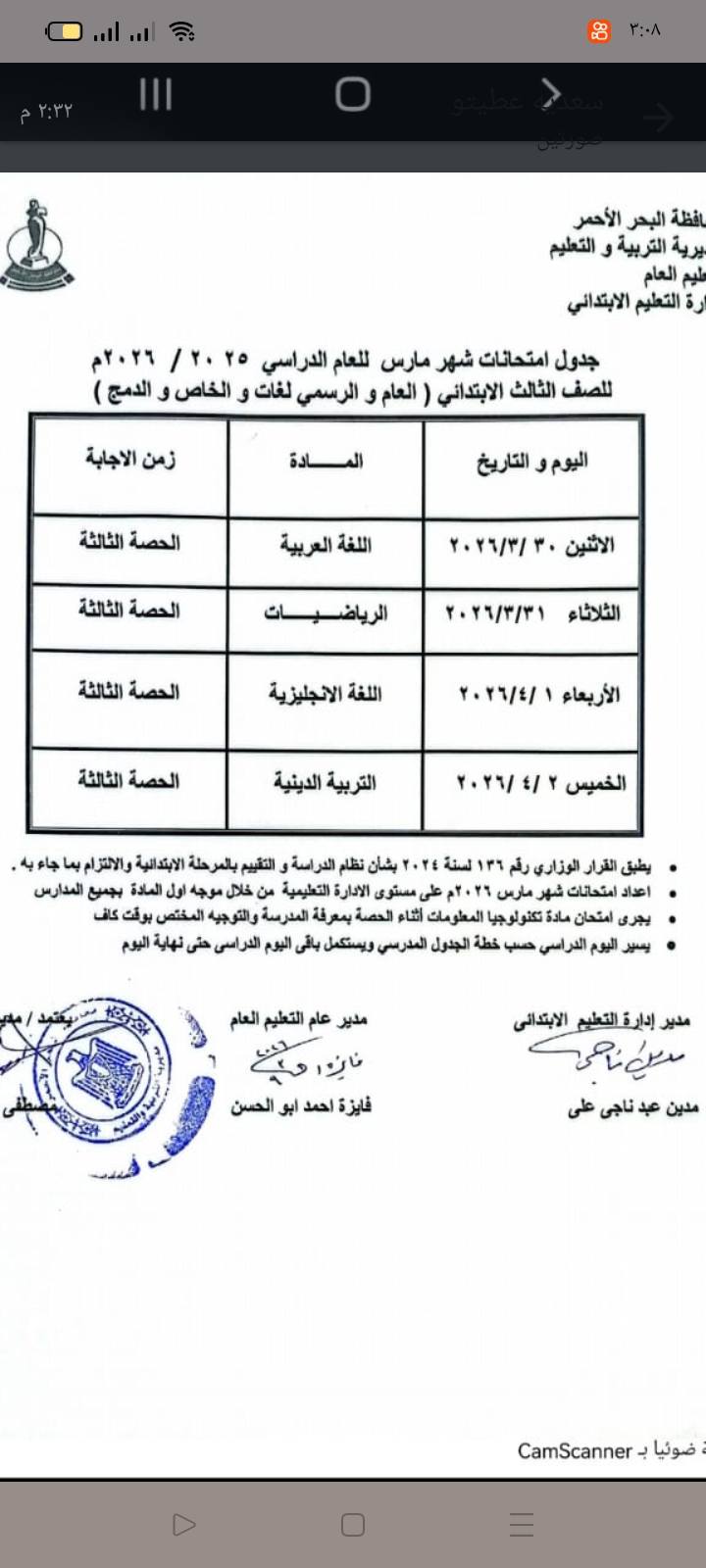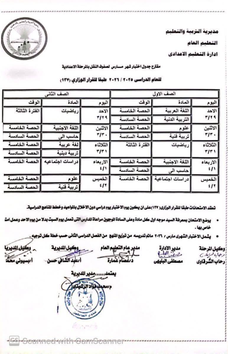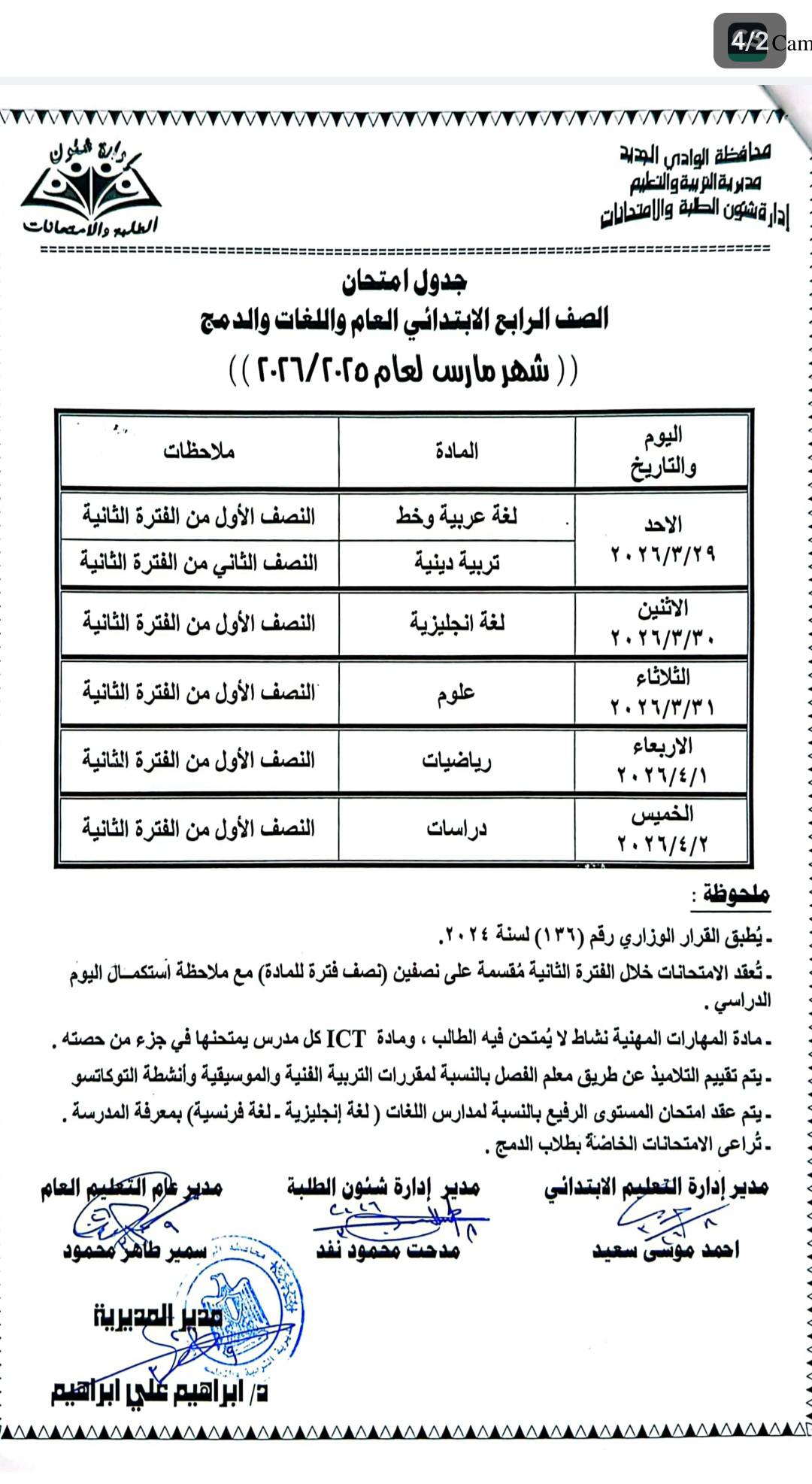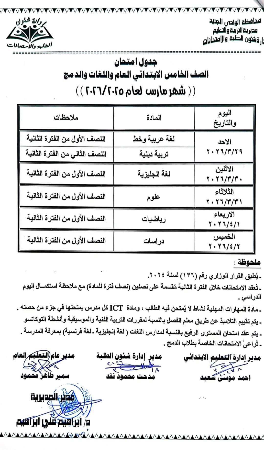 - يتم اداء امتحانات شهر مارس 2026 خلال اليوم الدراسي ويتم استكمال باقي اليوم الدراس بشكل طبيعي وفقا لجدول المدرسة