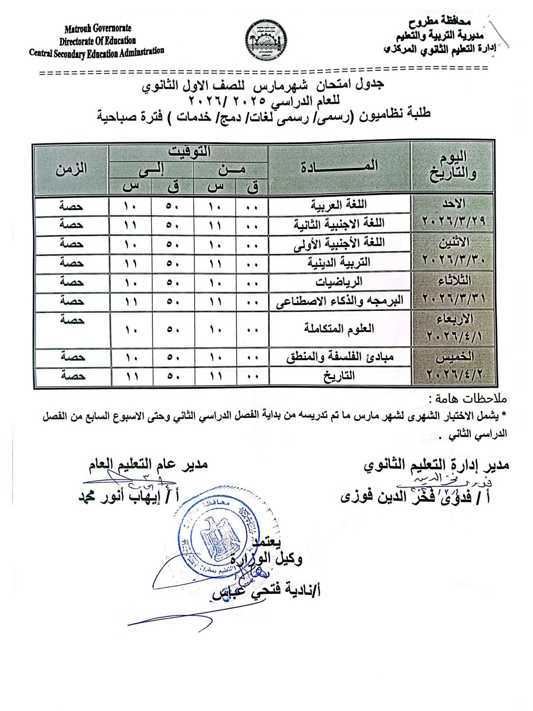 - يتم إعلان جدول امتحانات شهر مارس 2026 في مكان بارز بالمدرسة يكون واضحاً للطلاب وأولياء الأمور