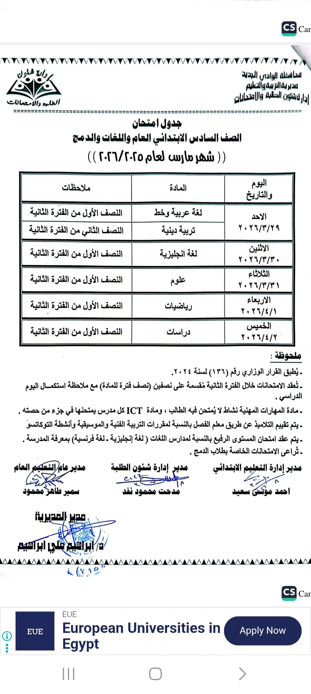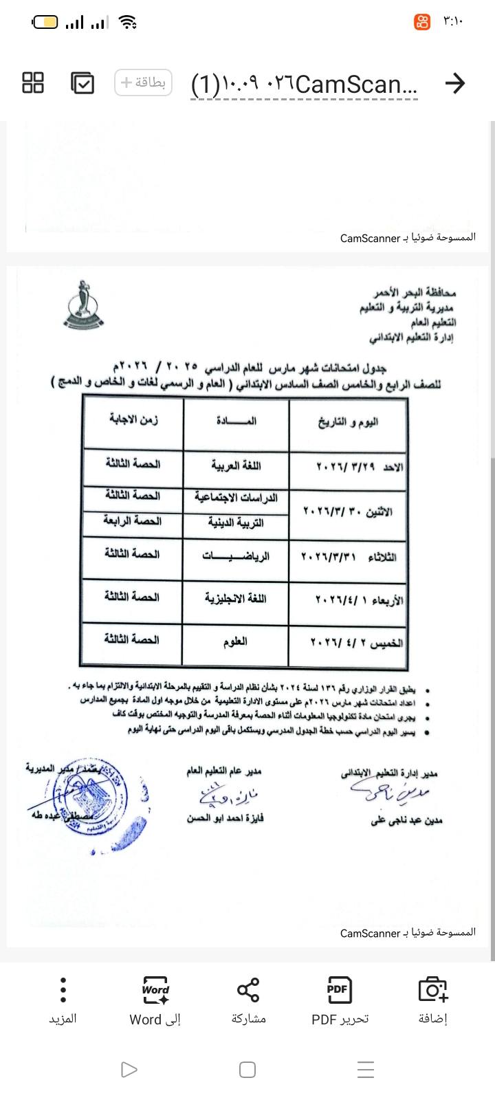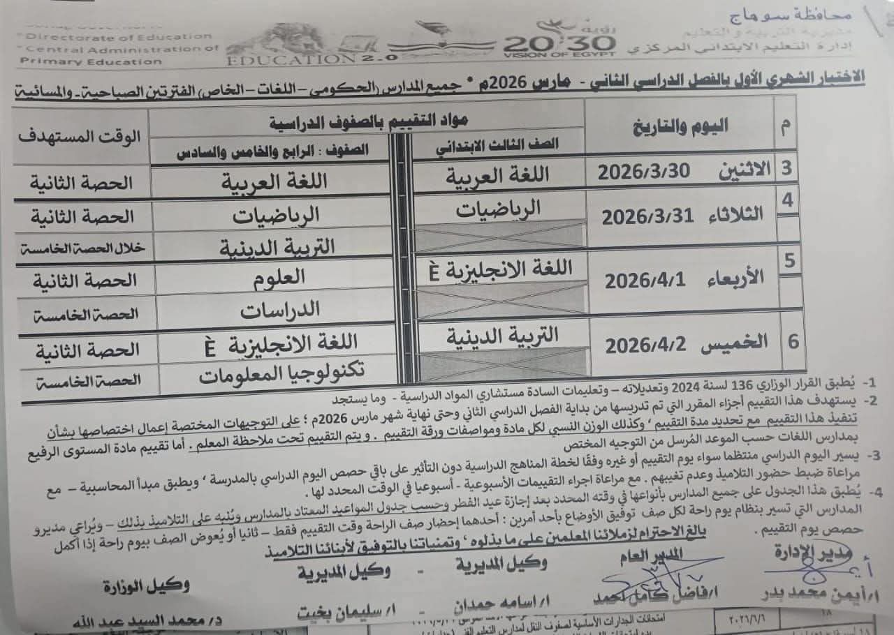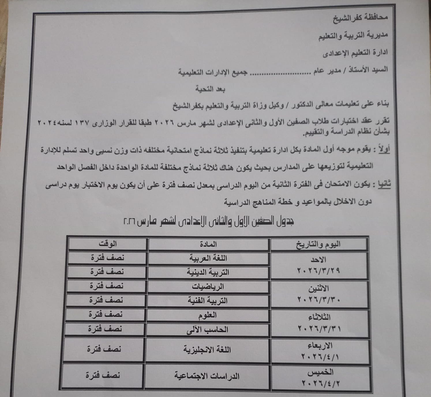 و قررت وزارة التربية والتعليم والتعليم الفني ، اجراء امتحانات شهر مارس 2026 اعتبارا من السبت الموافق ٢٨ مارس ٢٠٢٦ للمديريات التعليمية التي تعمل بها المدارس من يوم السبت ويوم الأحد الموافق ٢٩ مارس ٢٠٢٦ للمديريات التعليمية التي تعمل بها المدارس من يوم الأحد.