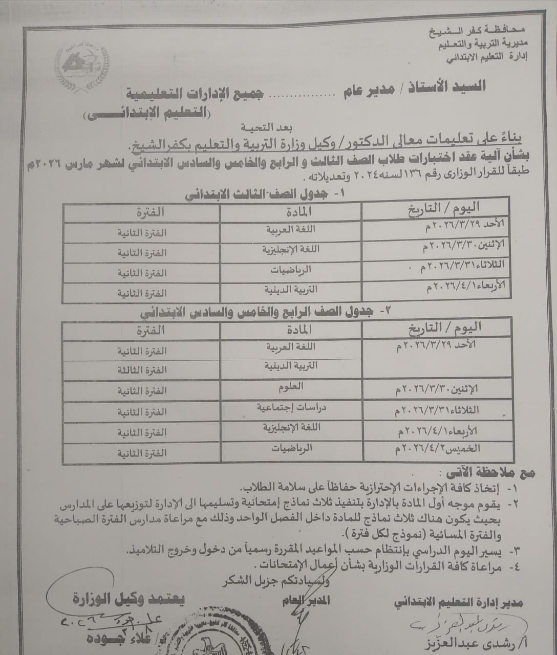 - يقوم مديري الإدارات التعليمية بإتخاذ ما يلزم من إجراءات لضمان سرية امتحانات شهر مارس 2026