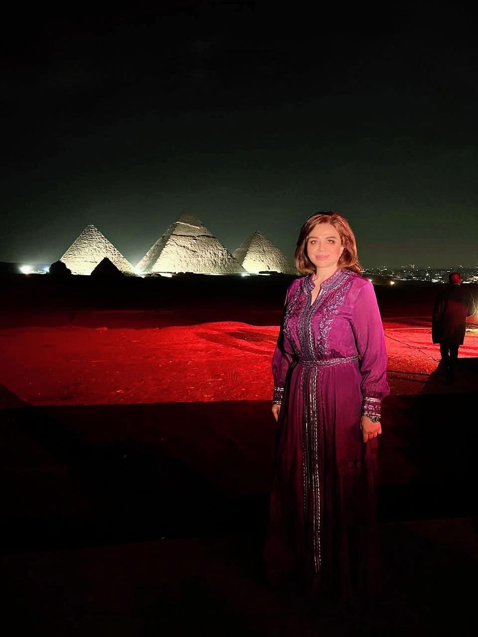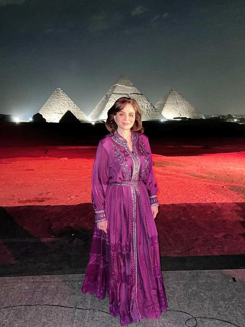 وظهرت إلهام شاهين بإطلالة محتشمة، من أمام الأهرامات في الجيزة، وعلقت: “بحبك يا مصر”.