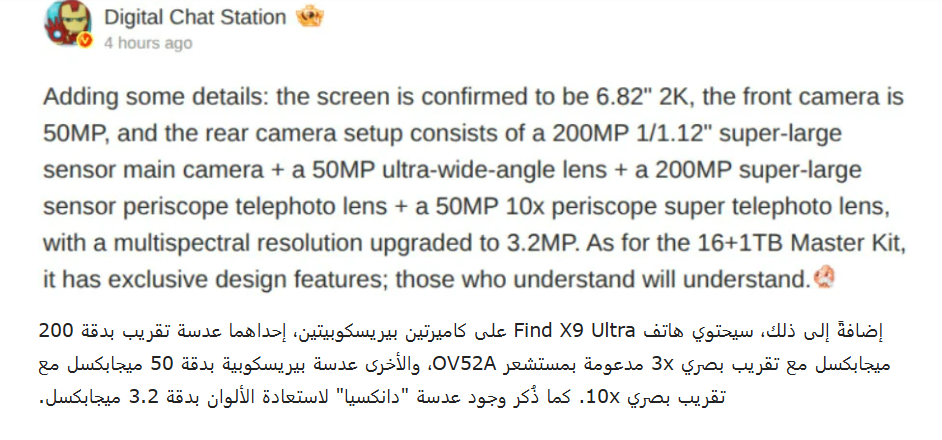 من المتوقع الإعلان عن هاتف Oppo Find X9 Ultra قريبًا ، لكننا ما زلنا ننتظر تحديد موعد ومكان الإعلان. لحسن الحظ، كشفت التسريبات بالفعل عن الكثير من مواصفات الهاتف. وقد أكد تسريب جديد من Digital Chat Station اليوم صحة هذه التوقعات.