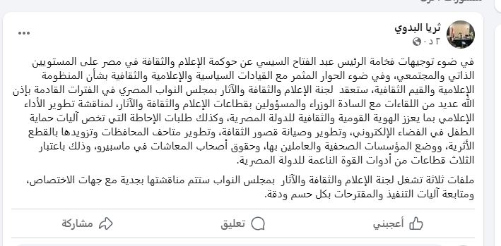 وأوضحت البدوي علي صفحتها الشخصية فيس بوك أن اللجنة ستتابع بجدية ملفات عدة، أبرزها: حماية الطفل في الفضاء الإلكتروني، تطوير وصيانة قصور الثقافة، تحديث متاحف المحافظات وتزويدها بالقطع الأثرية، فضلاً عن دراسة أوضاع المؤسسات الصحفية وحقوق العاملين وأصحاب المعاشات في ماسبيرو، باعتبار هذه القطاعات أدوات قوة ناعمة للدولة.