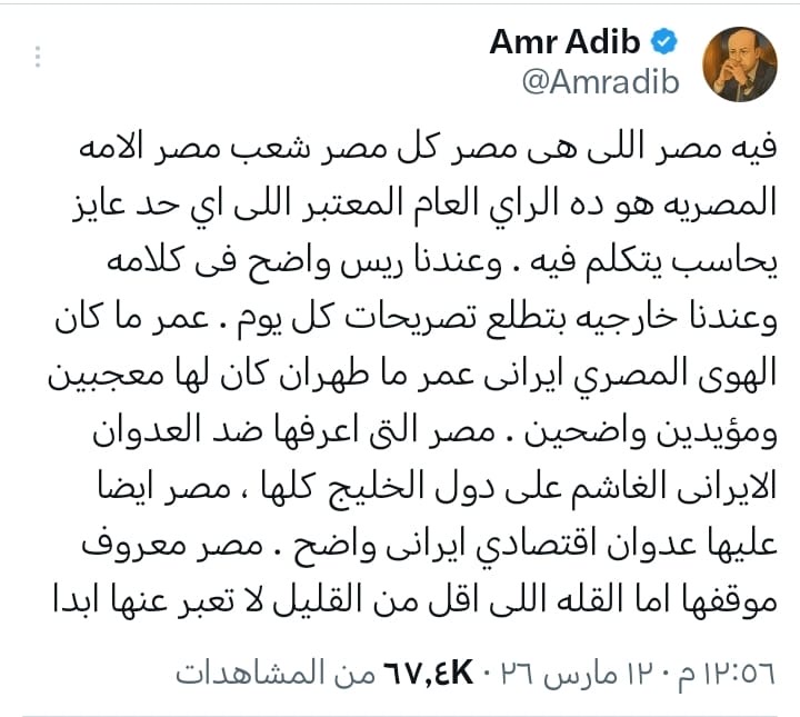 واختتم: "مصر التى أعرفها ضد العدوان الإيرانى الغاشم على دول الخليج كلها، مصر أيضا عليها عدوان اقتصادي إيرانى واضح، مصر معروف موقفها، أما القلة اللى أقل من القليل لا تعبر عنها أبدا".