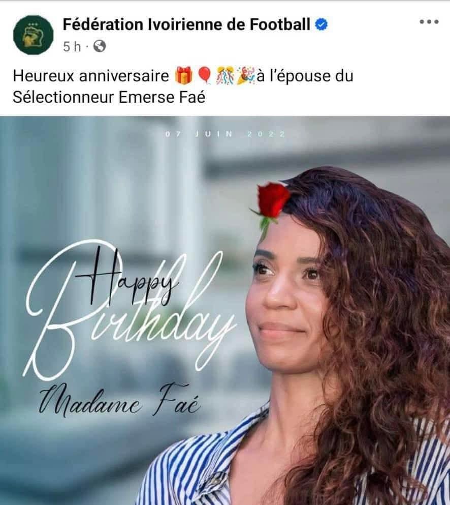 أثار الحساب الرسمي للاتحاد الإيفواري لكرة القدم حالة واسعة من الجدل على مواقع التواصل الاجتماعي، بعد نشره تهنئة بعيد ميلاد زوجة مدرب المنتخب الوطني إيميرس فاي، رغم أنها لم تمثل منتخب كوت ديفوار أو ترتبط بشكل مباشر بتاريخ كرة القدم في البلاد.