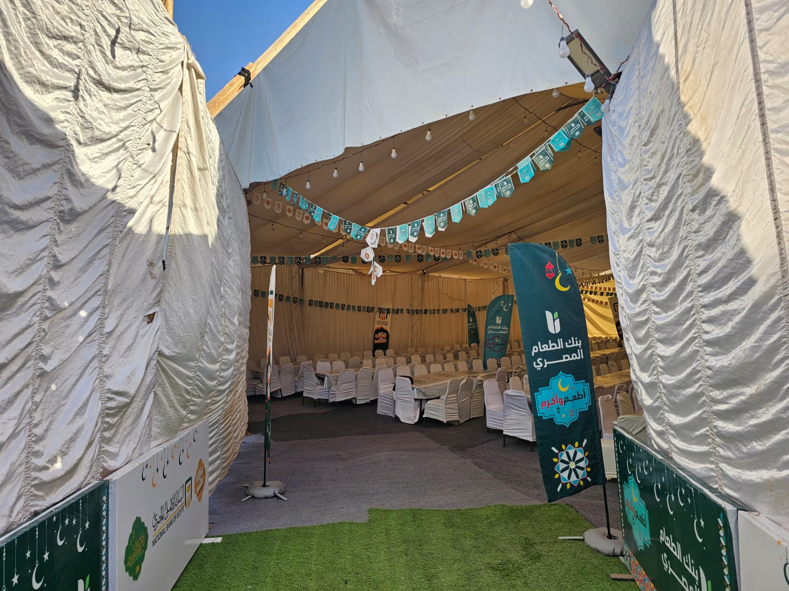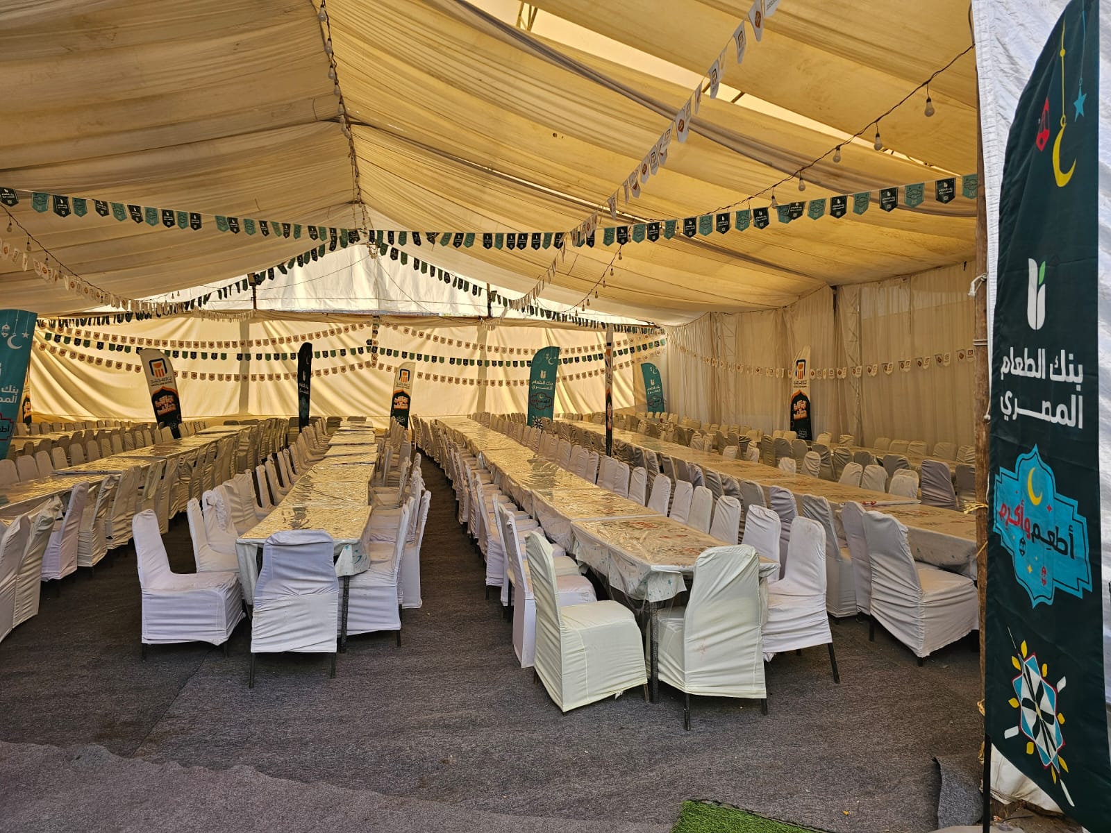 وأشار إلى أنه يتم يوميًا من خلال الخيمة تقديم ٥٠٠ وجبة إفطار مطهية للصائمين، إضافة إلى ٥٠٠ وجبة سحور، لافتًا إلى أن المائدة مفتوحة للجميع خلال شهر رمضان، ويتم تقديم الإفطار من خلال مجموعة من المتطوعين من البنك والجمعيات الأهلية.