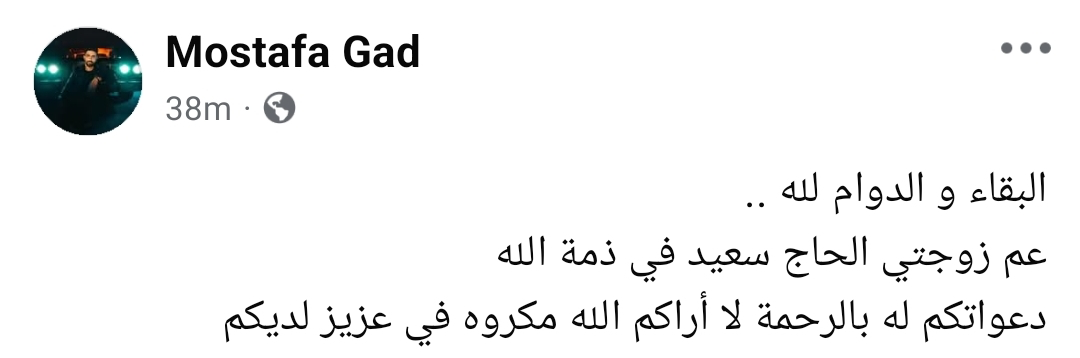 وكتب جاد: "البقاء والدوام لله.. عم زوجتي الحاج سعيد في ذمة الله.. دعواتكم له بالرحمة.. لا أراكم الله مكروه في عزيز لديكم".