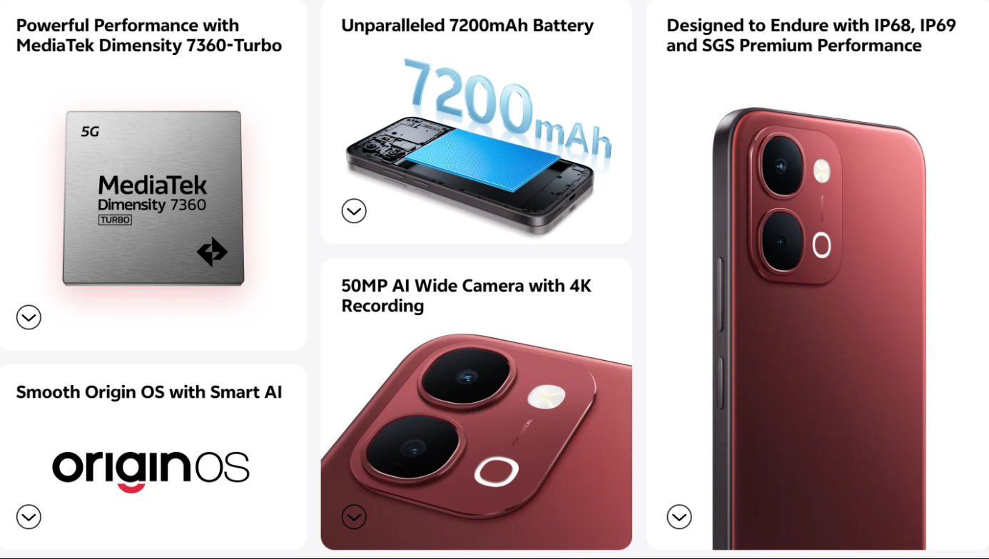 ويأتي الجهاز مع 8 جيجابايت رام LPDDR4x وخيارات تخزين 128 أو 256 جيجابايت UFS 3.1، ويعمل بنظام Android 16 مع واجهة OriginOS 6. كما يدعم الهاتف شريحتي SIM من نوع Nano، وشبكات 5G بنظامي SA وNSA.