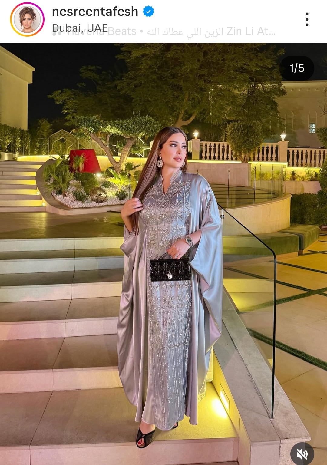 تألقت نسرين طافش في الصور بإطلالة رمضانية، حيث ظهرت مرتدية قفطانا طويلا باللون الرمادي اللامع بتطريزات بسيطة تبرز أناقتها.