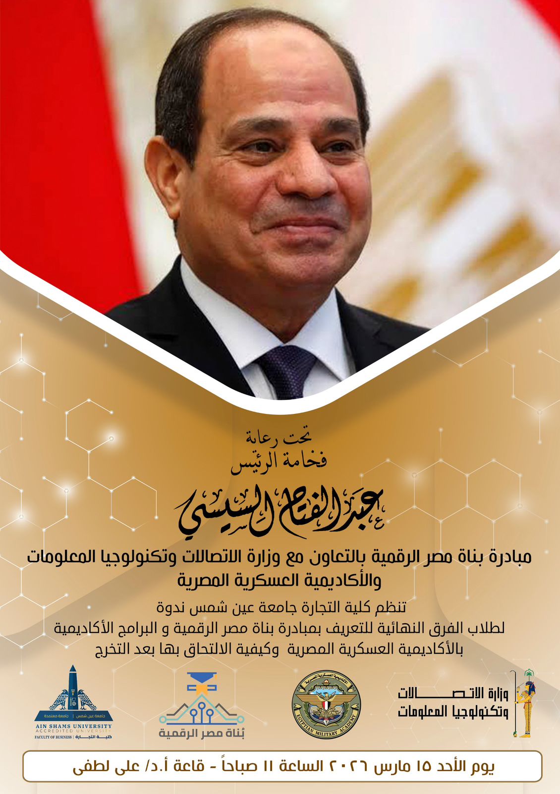 يُعقد الحدث يوم الأحد الموافق 15 مارس 2026، في تمام الساعة الحادية عشرة صباحاً بقاعة الدكتور علي لطفي بكلية التجارة - جامعة عين شمس.