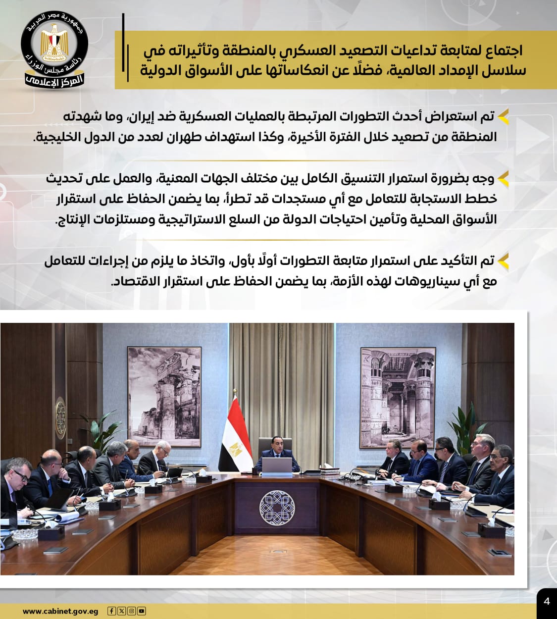 وعقد رئيس الوزراء اجتماعًا لمتابعة تداعيات التصعيد العسكري بالمنطقة وتأثيراتها في سلاسل الإمداد العالمية، فضلًا عن انعكاساتها على الأسواق الدولية، حيث تم استعراض أحدث التطورات المرتبطة بالعمليات العسكرية ضد إيران، وما شهدته المنطقة من تصعيد خلال الفترة الأخيرة، وكذا استهداف طهران لعدد من الدول الخليجية.