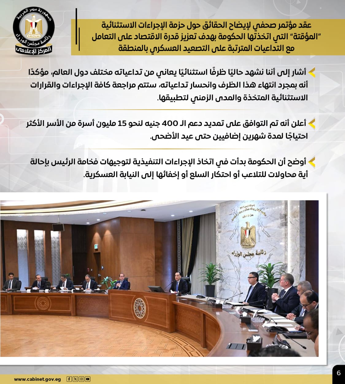 وعقد رئيس الوزراء مؤتمرًا صحفيًا لإيضاح الحقائق حول حزمة الإجراءات الاستثنائية "المؤقتة" التي اتخذتها الحكومة بهدف تعزيز قدرة الاقتصاد على التعامل مع التداعيات المترتبة على التصعيد العسكري بالمنطقة، حيث أشار إلى أننا نشهد حاليًا ظرفًا استثنائيًا يعاني من تداعياته مختلف دول العالم، مؤكدًا أنه بمجرد انتهاء هذا الظرف وانحسار تداعياته ستتم مراجعة كافة الإجراءات والقرارات الاستثنائية المتخذة والمدى الزمني لتطبيقها.