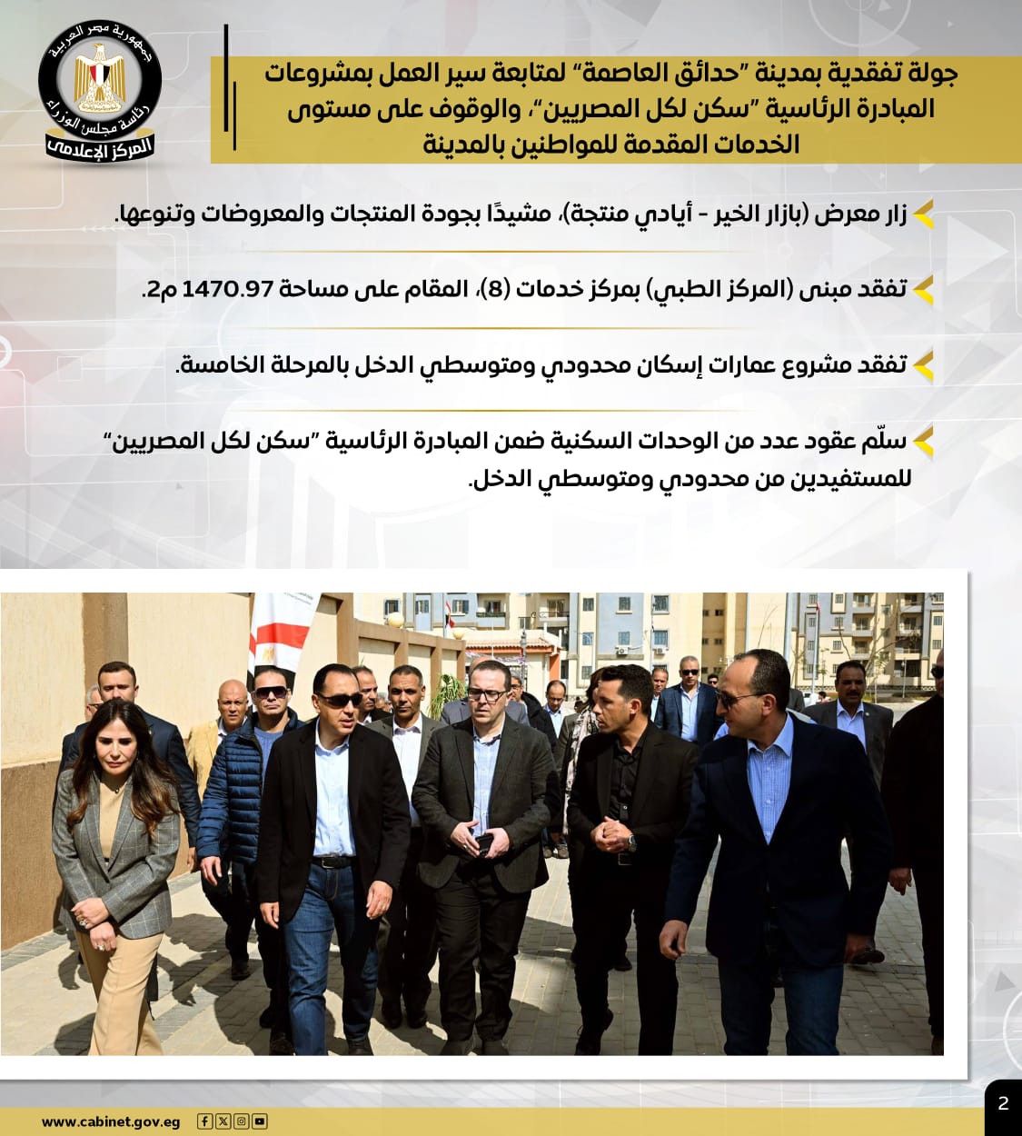 كما أجرى جولة تفقدية بمدينة "حدائق العاصمة"، لمتابعة سير العمل بمشروعات المبادرة الرئاسية "سكن لكل المصريين"، والوقوف على مستوى الخدمات المقدمة للمواطنين بالمدينة، حيث زار معرض "بازار الخير – أيادي منتجة"، وأشاد بجودة المنتجات والمعروضات وتنوعها.