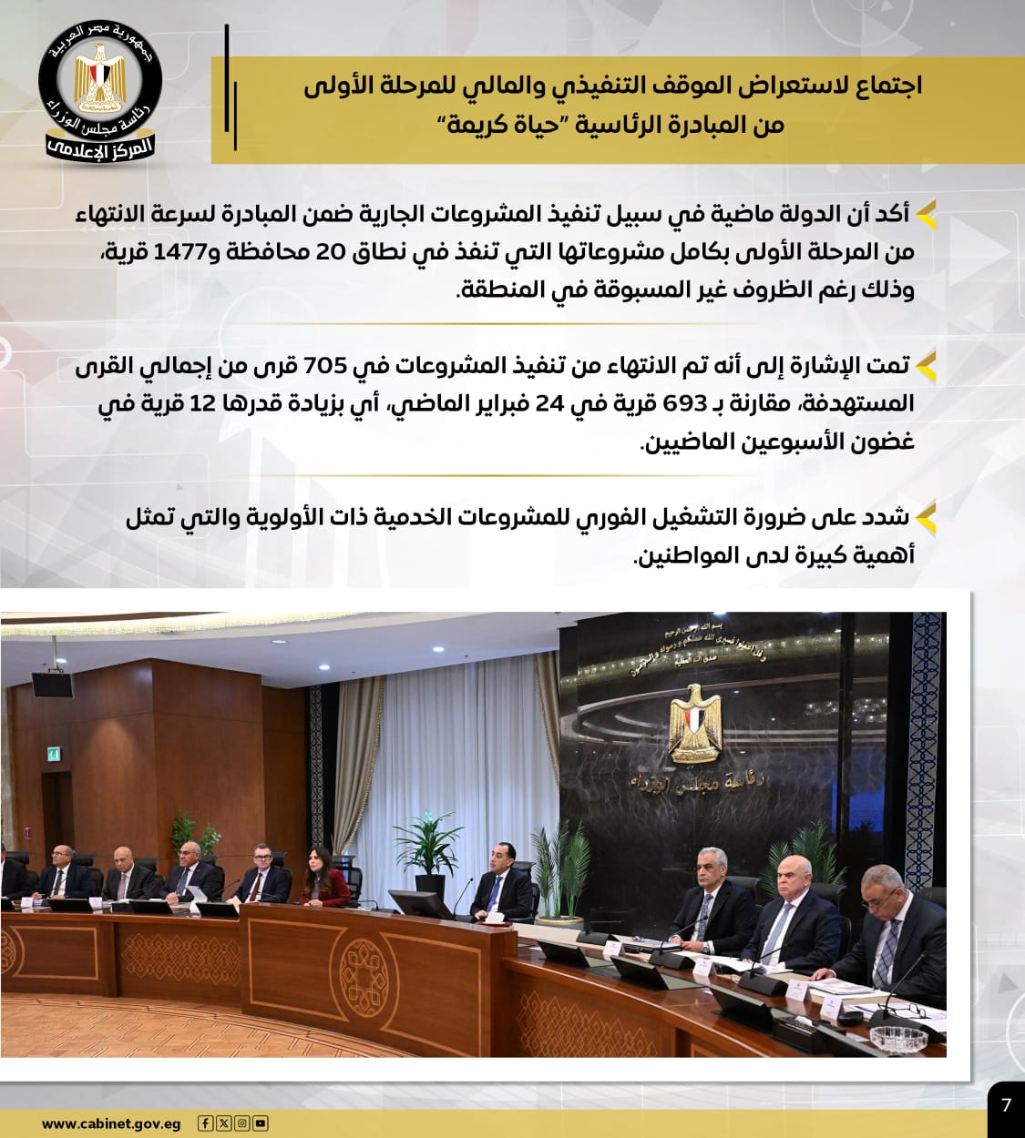 وتمت الإشارة إلى أنه تم الانتهاء من تنفيذ المشروعات في 705 قرى من إجمالي القرى المستهدفة، مقارنة بـ 693 قرية في 24 فبراير الماضي، أي بزيادة قدرها 12 قرية خلال الأسبوعين الماضيين، مع التشديد على ضرورة التشغيل الفوري للمشروعات الخدمية ذات الأولوية التي تمثل أهمية كبيرة لدى المواطنين.
