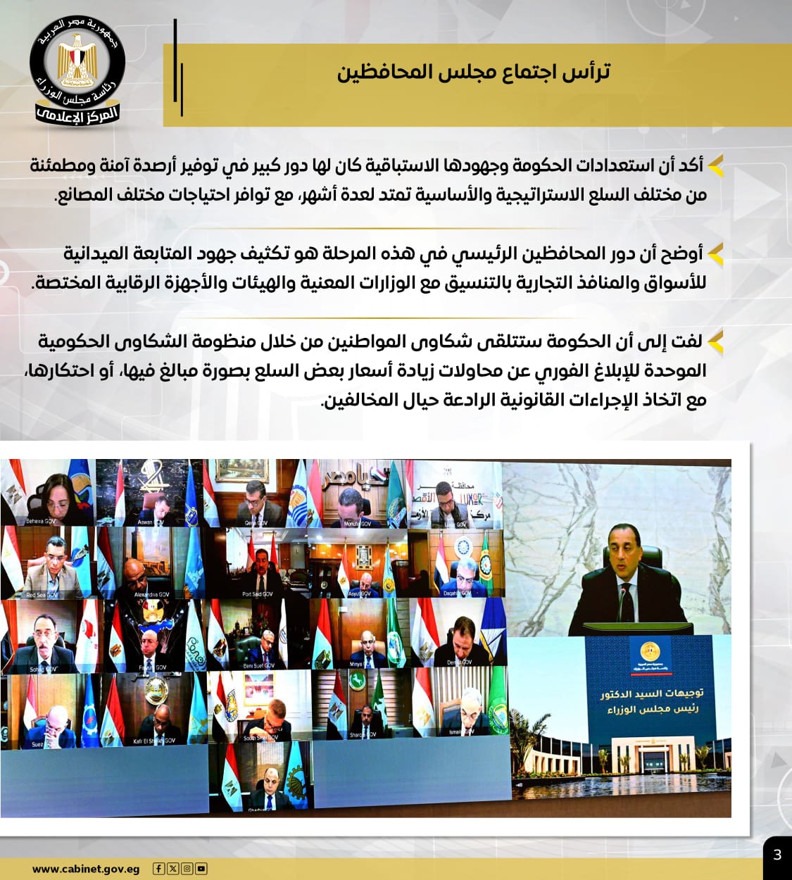كما أوضح أن دور المحافظين الرئيسي في هذه المرحلة هو تكثيف جهود المتابعة الميدانية للأسواق والمنافذ التجارية بالتنسيق مع الوزارات المعنية والهيئات والأجهزة الرقابية المختصة، لافتًا إلى أن الحكومة ستتلقى شكاوى المواطنين من خلال منظومة الشكاوى الحكومية الموحدة للإبلاغ الفوري عن محاولات زيادة أسعار بعض السلع بصورة مبالغ فيها أو احتكارها، مع اتخاذ الإجراءات القانونية الرادعة حيال المخالفين.