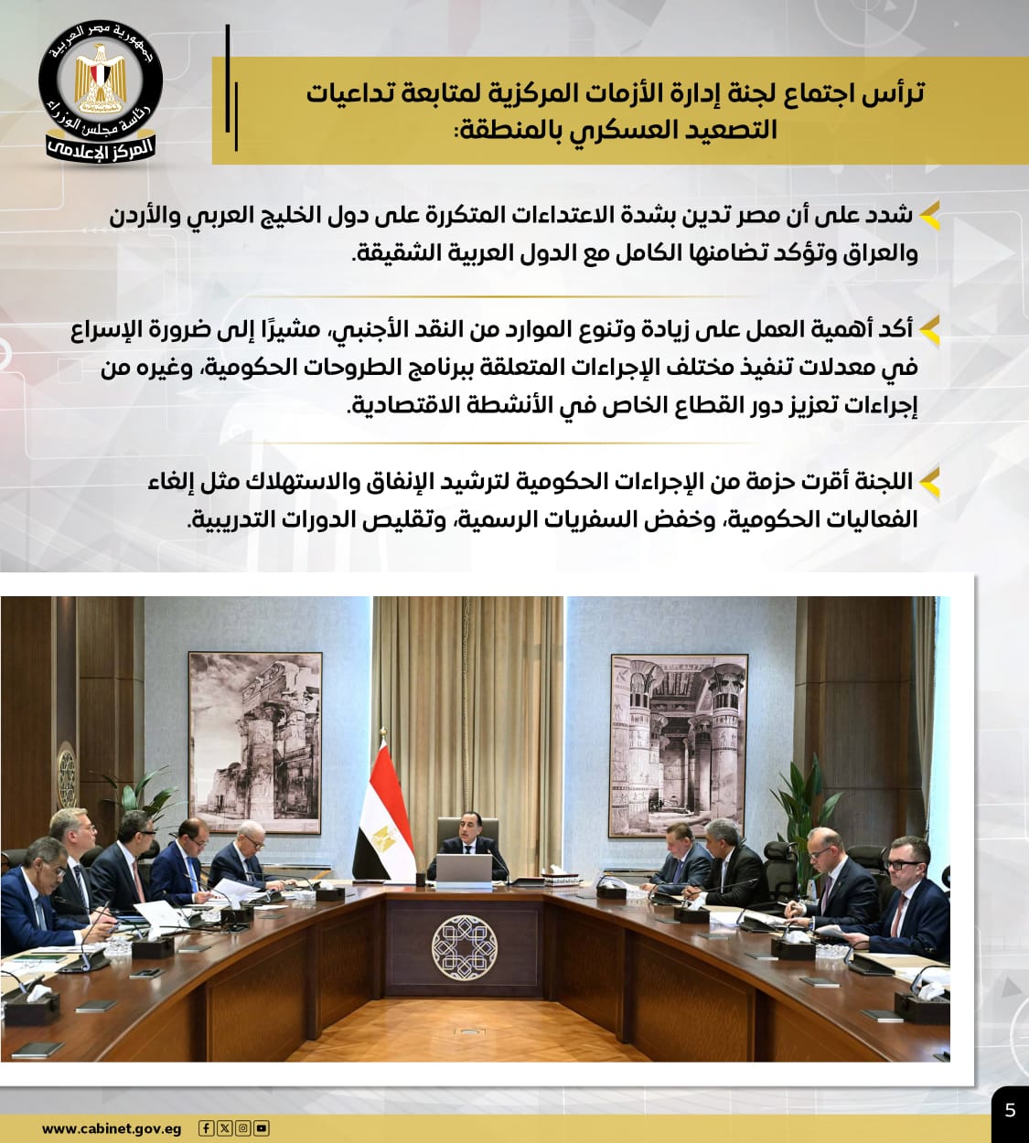 كما ترأس اجتماع لجنة إدارة الأزمات المركزية لمتابعة تداعيات التصعيد العسكري بالمنطقة، مشددًا على أن مصر تدين بشدة الاعتداءات المتكررة على دول الخليج العربي والأردن والعراق، وتؤكد تضامنها الكامل مع الدول العربية الشقيقة، مؤكدًا أهمية العمل على زيادة وتنوع الموارد من النقد الأجنبي.