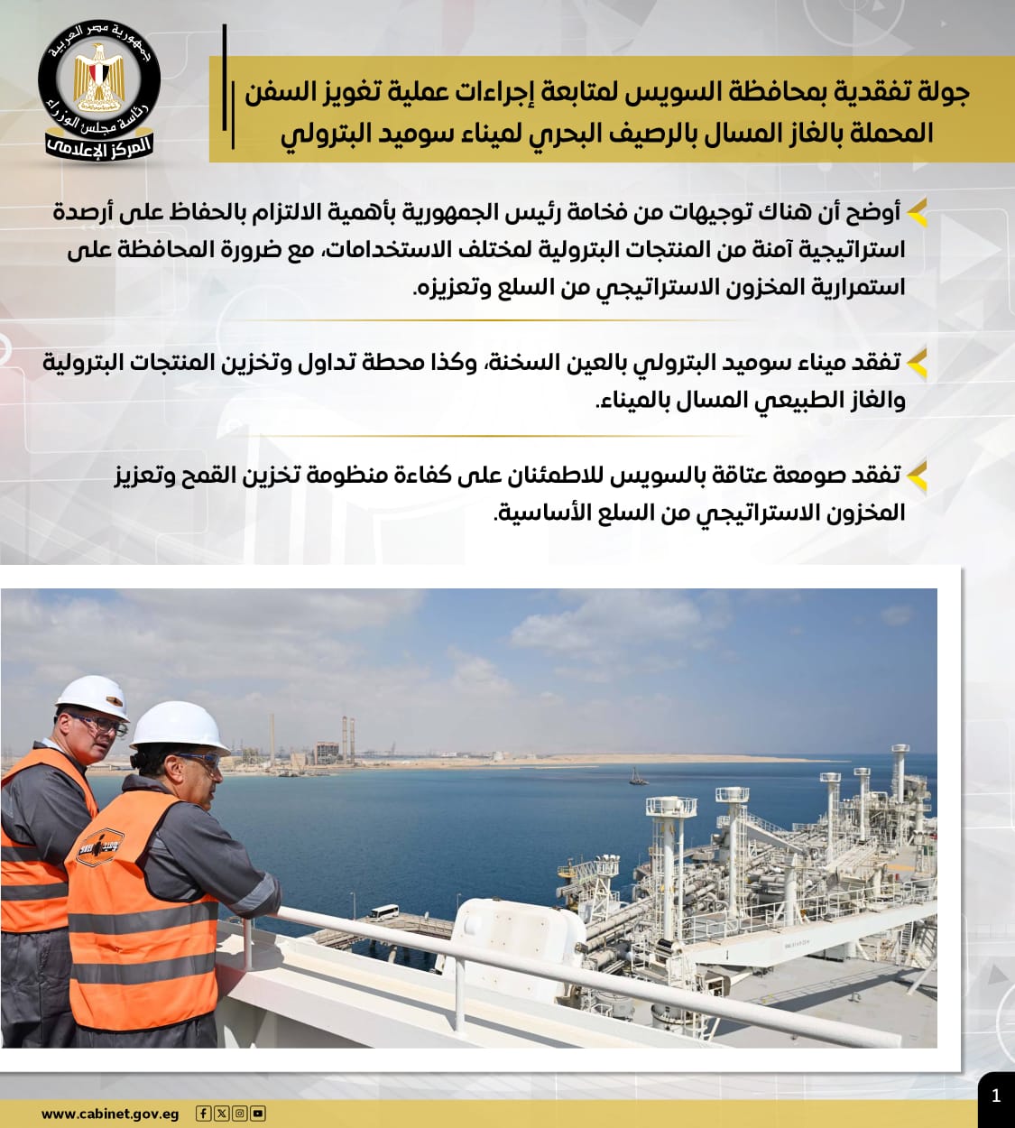 وتضمنت الأنشطة، قيام رئيس الوزراء بجولة تفقدية بمحافظة السويس لمتابعة إجراءات عملية تغويز السفن المحملة بالغاز المسال بالرصيف البحري لميناء سوميد البترولي، موضحًا أن هناك توجيهات من رئيس الجمهورية بأهمية الالتزام بالحفاظ على أرصدة استراتيجية آمنة من المنتجات البترولية لمختلف الاستخدامات، مع ضرورة المحافظة على استمرارية المخزون الاستراتيجي من السلع وتعزيزه.