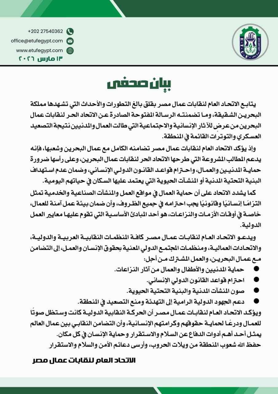 وأكد الاتحاد العام لنقابات عمال مصر، في بيان له، تضامنه الكامل مع عمال البحرين وشعبها، معربًا عن دعمه للمطالب المشروعة التي طرحها الاتحاد الحر لنقابات عمال البحرين، وفي مقدمتها ضرورة حماية المدنيين والعمال، واحترام قواعد القانون الدولي الإنساني، وضمان عدم استهداف البنية التحتية المدنية أو المنشآت الحيوية التي يعتمد عليها السكان في حياتهم اليومية.