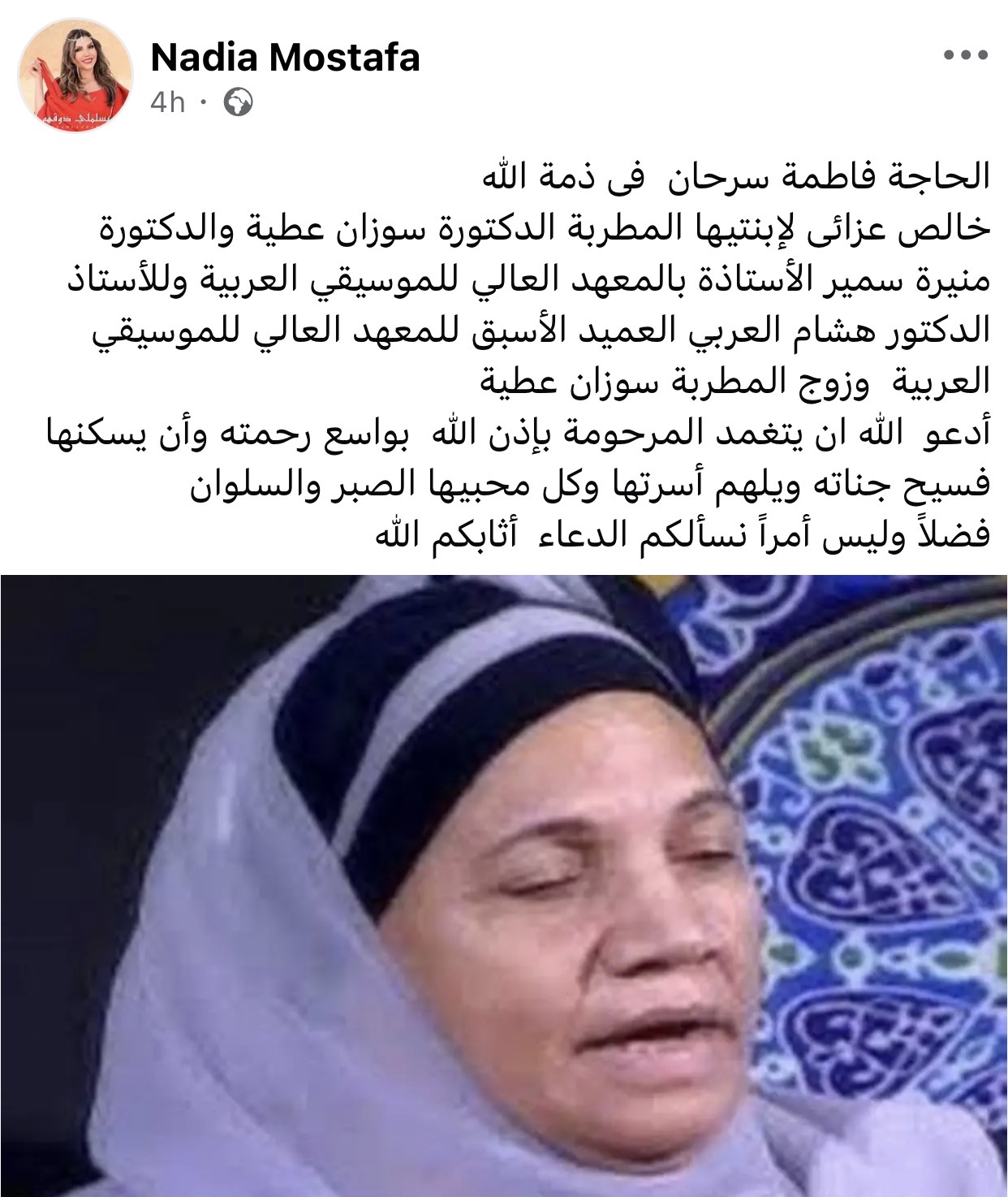 وكتبت نادية مصطفى في منشورها: «الحاجة فاطمة سرحان في ذمة الله، خالص عزائي لابنتيها المطربة الدكتورة سوزان عطية والدكتورة منيرة سمير الأستاذة بالمعهد العالي للموسيقى العربية، وللأستاذ الدكتور هشام العربي العميد الأسبق للمعهد العالي للموسيقى العربية وزوج المطربة سوزان عطية».