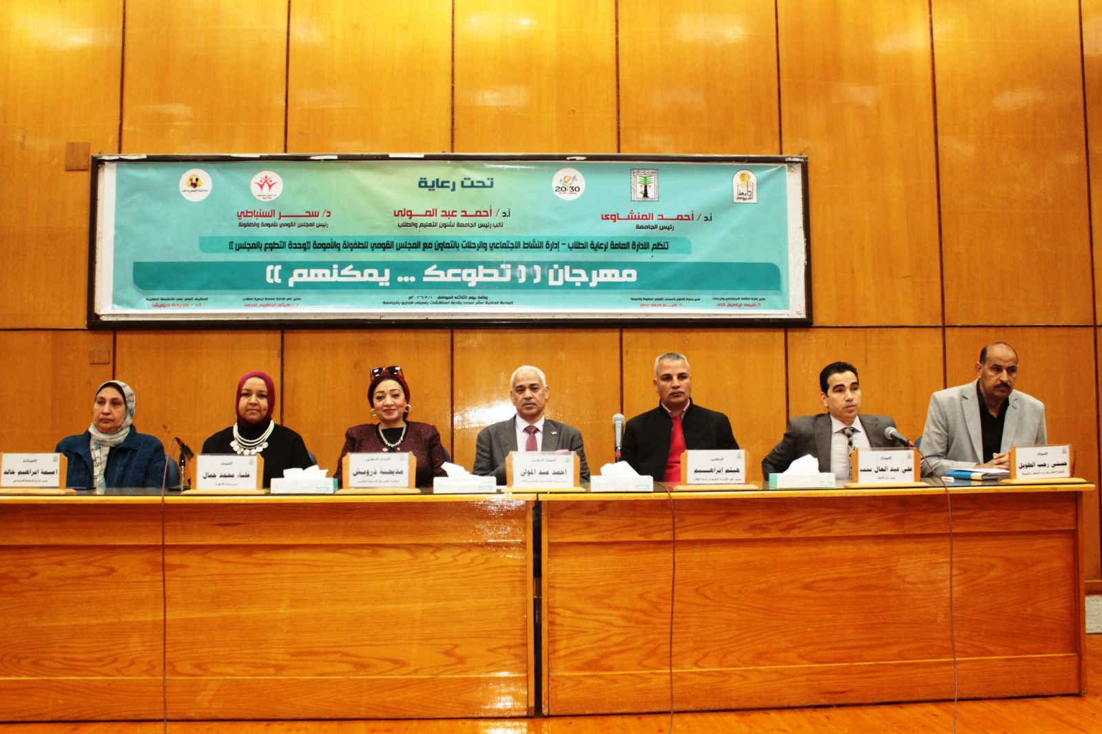 نظمت جامعة أسيوط مهرجان "تطوعك يمكنهم" الذي ينفذه المجلس القومي للطفولة والأمومة بمختلف الجامعات المصرية، وذلك تحت رعاية الدكتور أحمد المنشاوي رئيس جامعة أسيوط، والدكتورة سحر السنباطي رئيسة المجلس القومي للطفولة والأمومة.