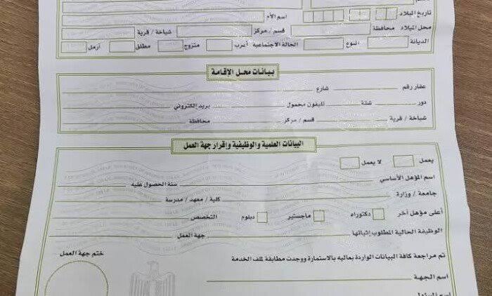 - تعبئة البيانات المطلوبة بدقة مثل الاسم، الرقم القومي، محل الإقامة، المهنة، وجهة العمل.