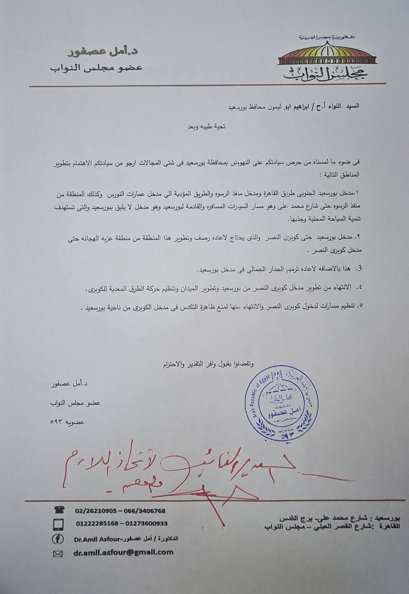 وقدمت النائبة أمل عصفور خلال لقاء سابق مع اللواء إبراهيم أبو ليمون، محافظ بورسعيد، مجموعة من الطلبات والمقترحات، تضمنت تطوير مدخل المدينة الغربي والحد من تراكمات الردش والقمامة التي تعوق دخول الأندية الجديدة وتؤثر على السكان، بالإضافة إلى رفع كفاءة الطرق واستكمال أعمال الإنارة، وتطوير مدخل المدينة الجنوبي والطريق المؤدي إلى منفذ الرسوة وعمارات النورس، إلى جانب إعادة رصف الطريق الممتد من منطقة عزبة الجبالي حتى مدخل كوبري النصر لتحسين السيولة المرورية، وترميم الجدار الجمالي بمدخل المدينة وتطوير وتنظيم المسارات المؤدية لكوبري النصر لضمان انسيابية الحركة وتخفيف التكدسات المرورية.
