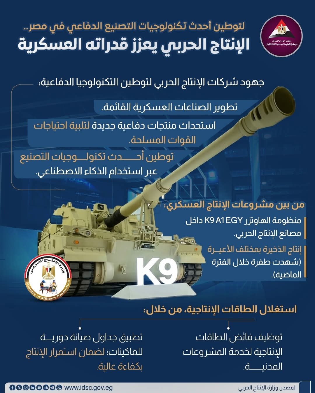 وتابع الانفوحراف أنه من بين مشروعات الانتاج العسكري منظومة الهاوترر k9 a1 egy داخل مصانع الإنتاج الحربي وإنتاج مختلف الاعيرة.