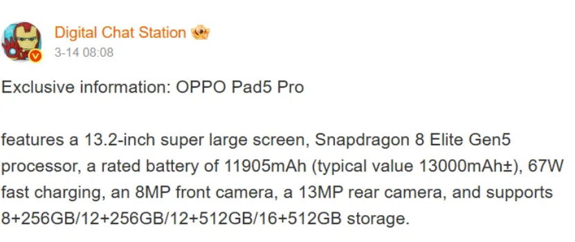 وقد جاءت هذه التفاصيل من مُسرّب المعلومات الشهير على منصة ويبو، Digital Chat Station، الذي نشر مواصفات الجهاز.