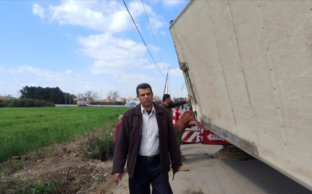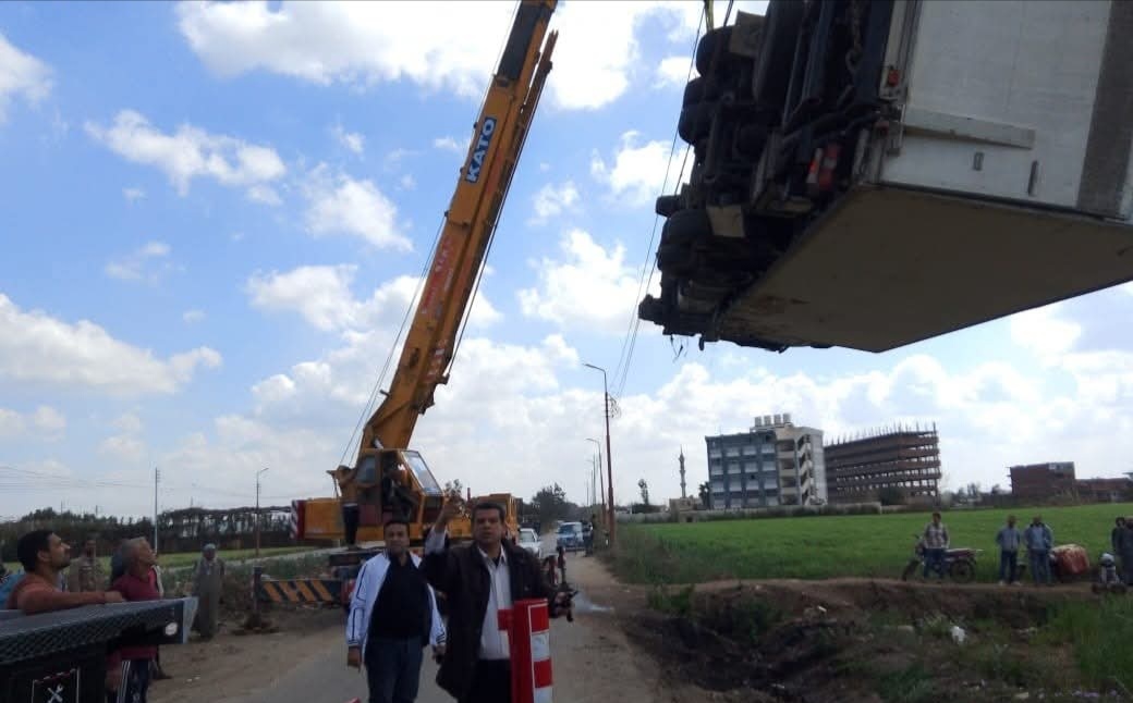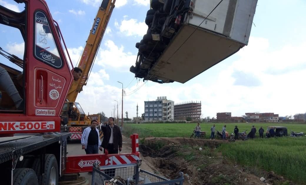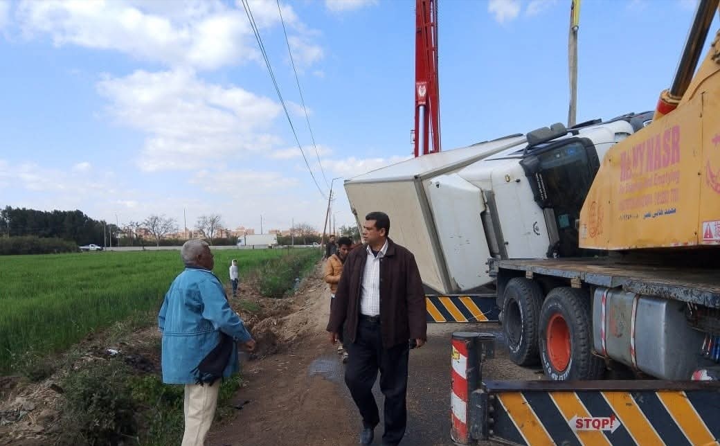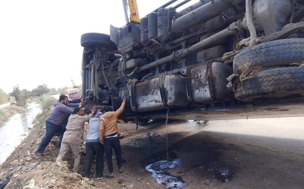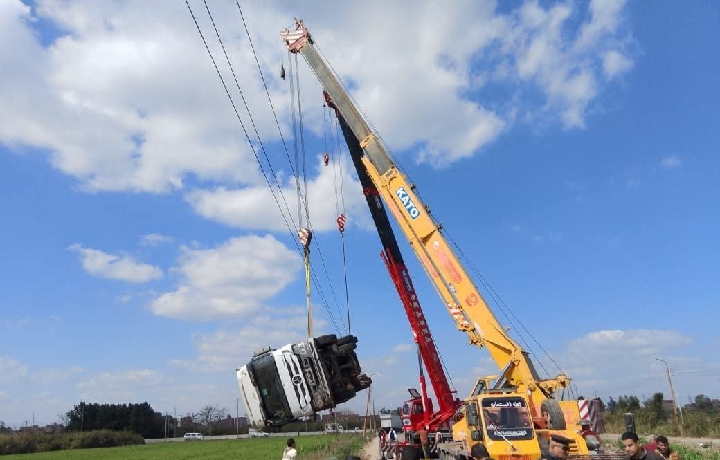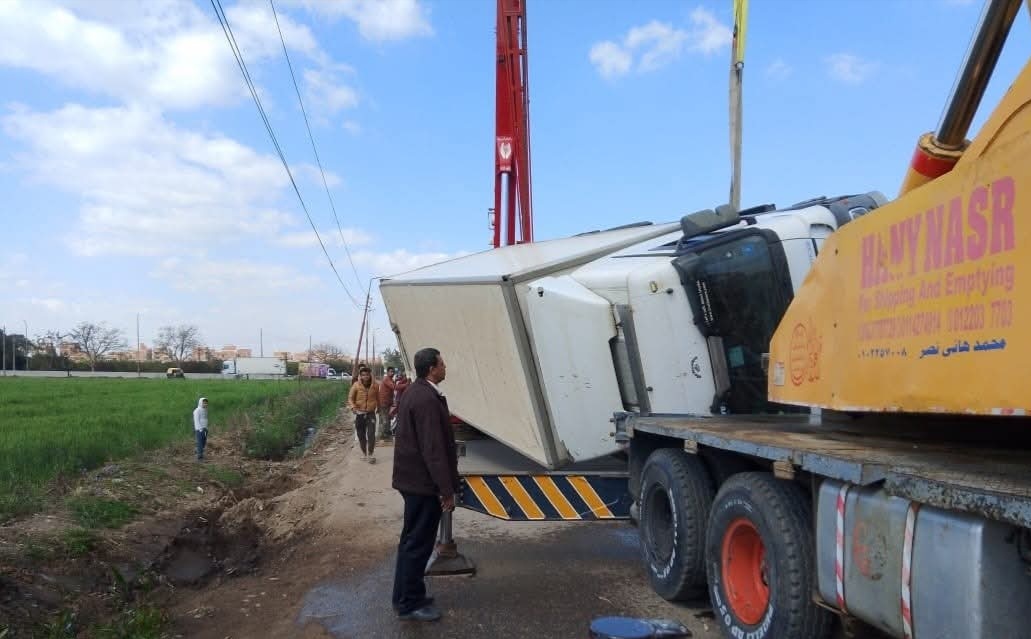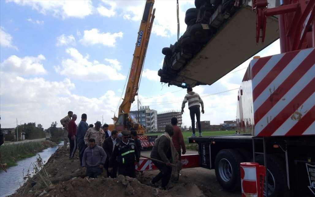 شهد مركز الباجور في محافظة المنوفية انقلاب سيارة تريلا بمصرف أم خليفة التابع للمركز.