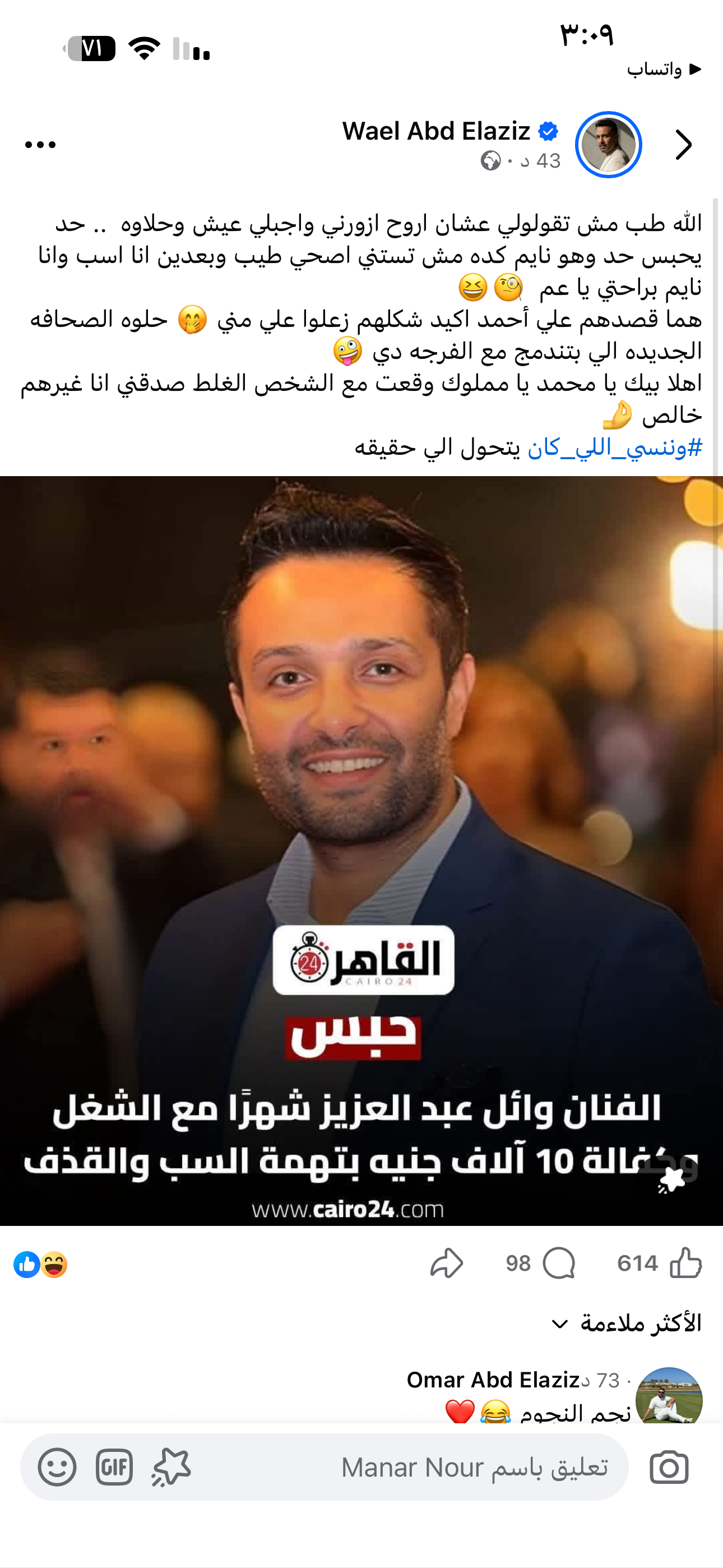 سخر الفنان وائل عبد العزيز من خير حبسه لمدة ١٠ اشهر بسبب قضية سب وقذف