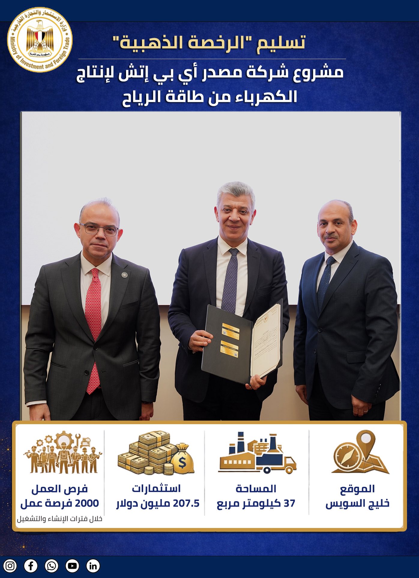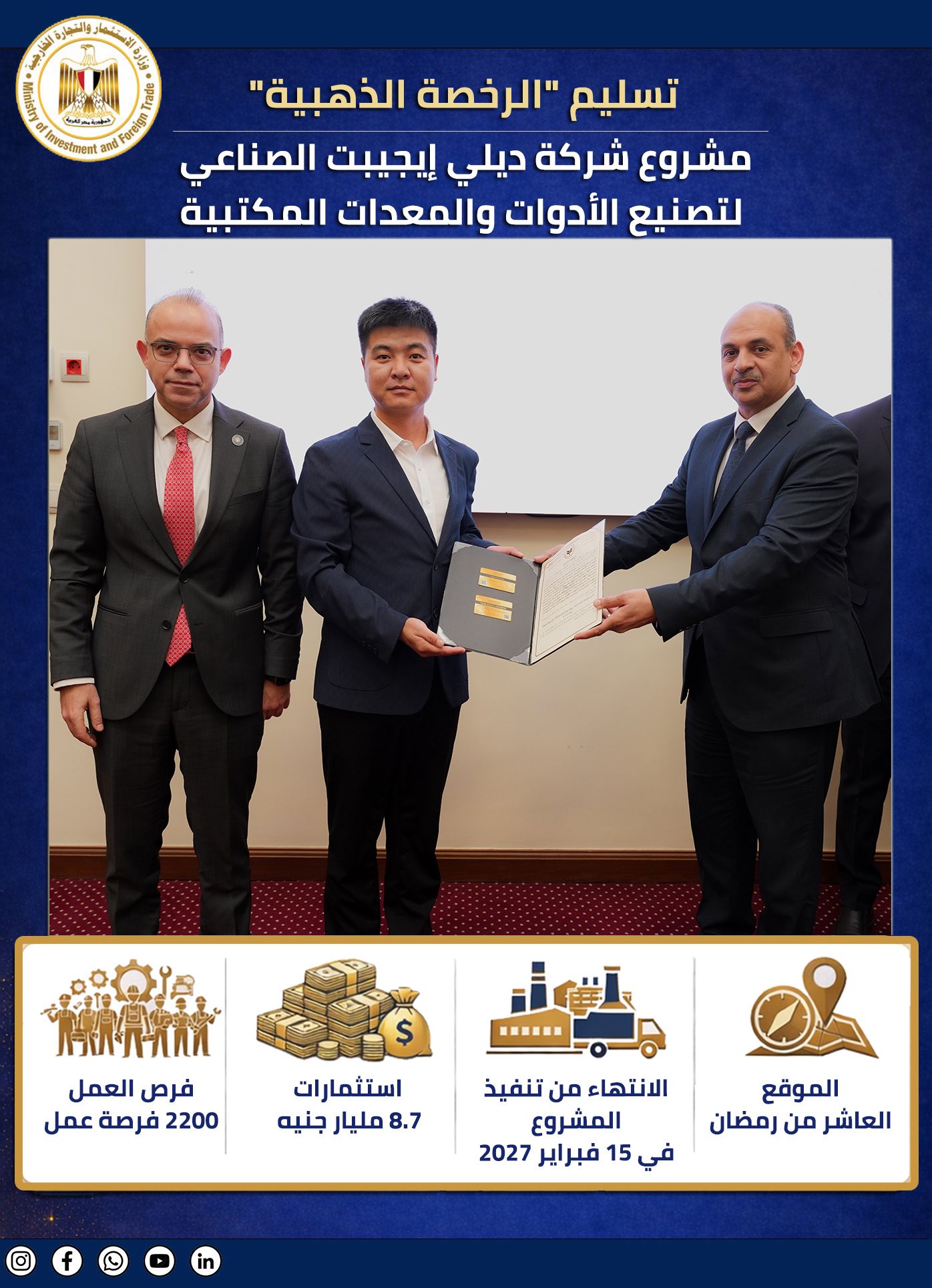 وقام أمس الدكتور محمد فريد صالح، وزير الاستثمار ، بتسليم 8 رخص ذهبية لمشروعات مصرية وعربية وأجنبية في قطاعات الطاقة، النقل، التصنيع، والخدمات اللوجستية والأغذية.