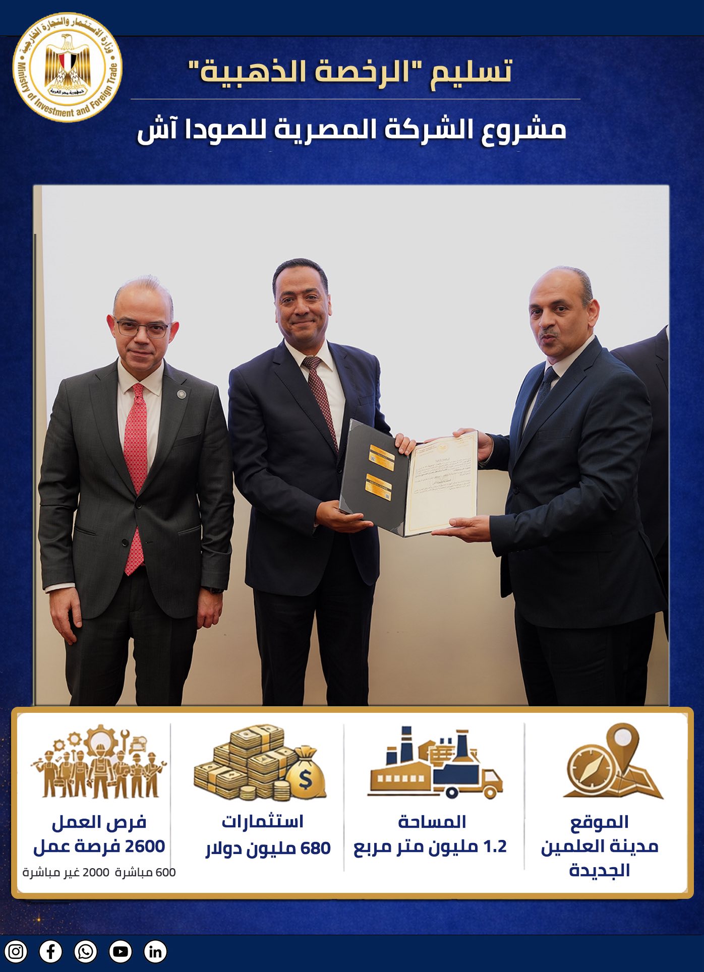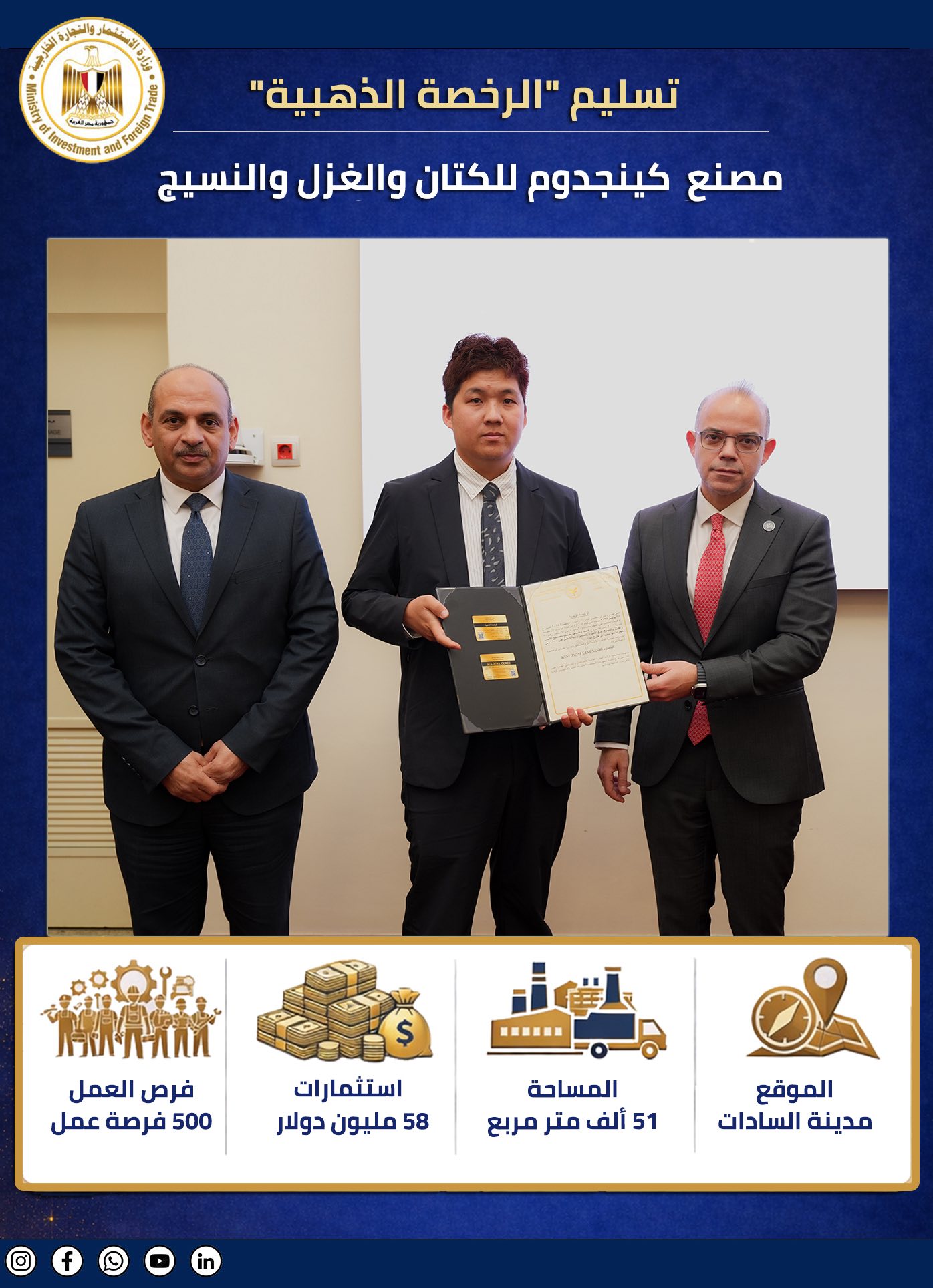 وأشارت الوزارة إلى أن الشركات الثمانية الحاصلة علي الرخص الذهبية هي : (ماك لتصنيع وسائل النقل – ميدلوج – المصرية للصودا – العلمين لمنتجات السيليكون – مصدر أي بي إتش – ديلي إيجيبت – كينجدوم للكتان- الأمير المصرية).