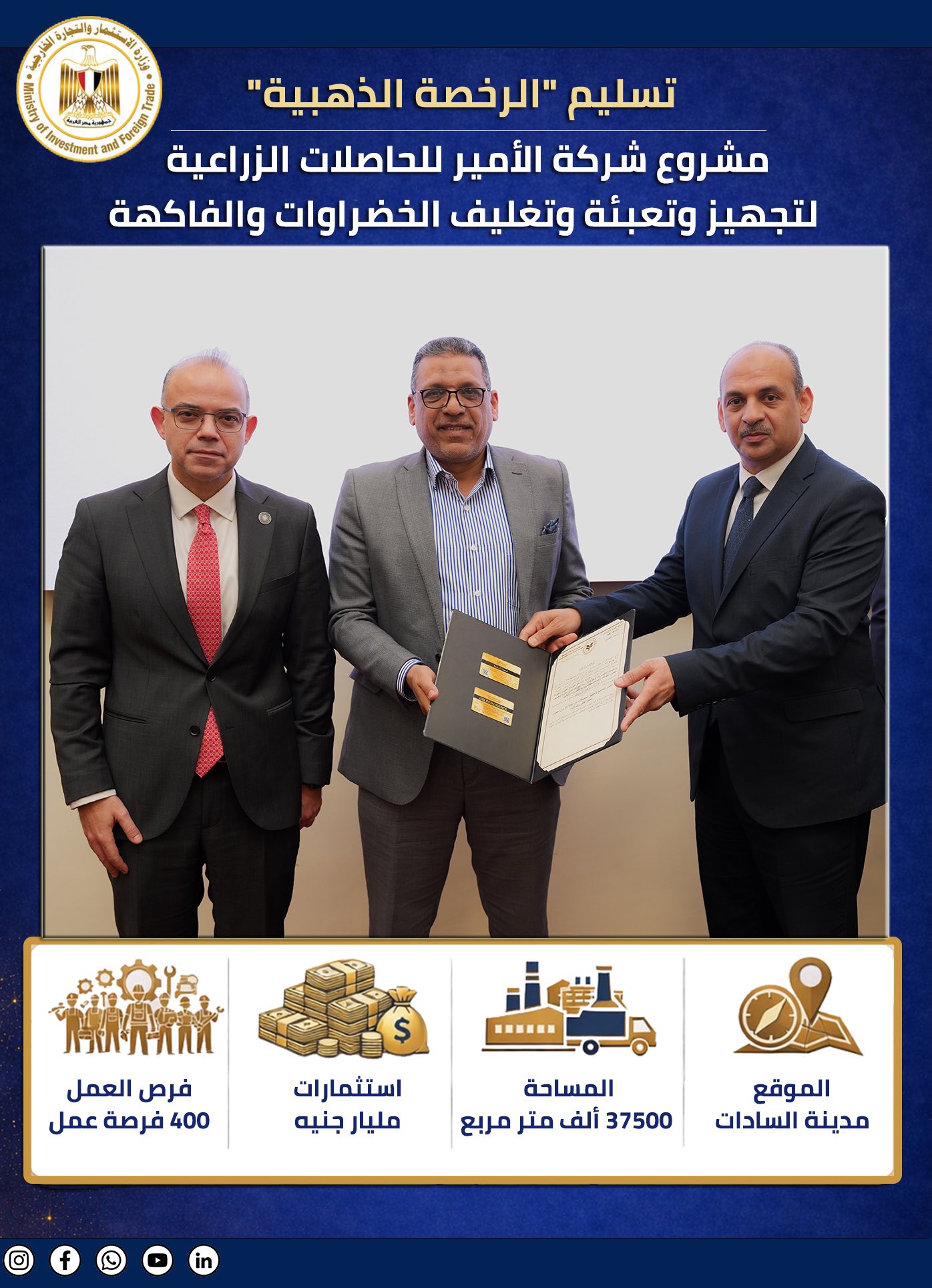 نشرت وزارة الاستثمار والتجارة الخارجية علي صحفتها الرسمية علي وسائل التواصل الاجتماعي “فيسبوك” إنفراجراف عن تفاصيل مشروعات الرخص الذهبية الجديدة البالغة عددهم 8 مشروعات بتكاليف إستثمارية بلغت 1.2 مليار دولار و16 مليار جنيه.