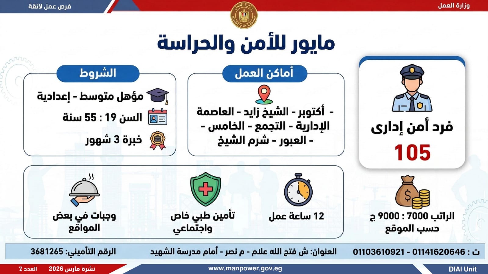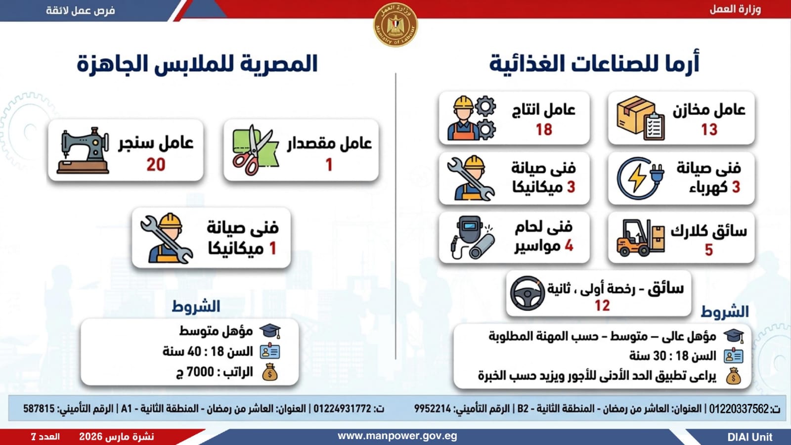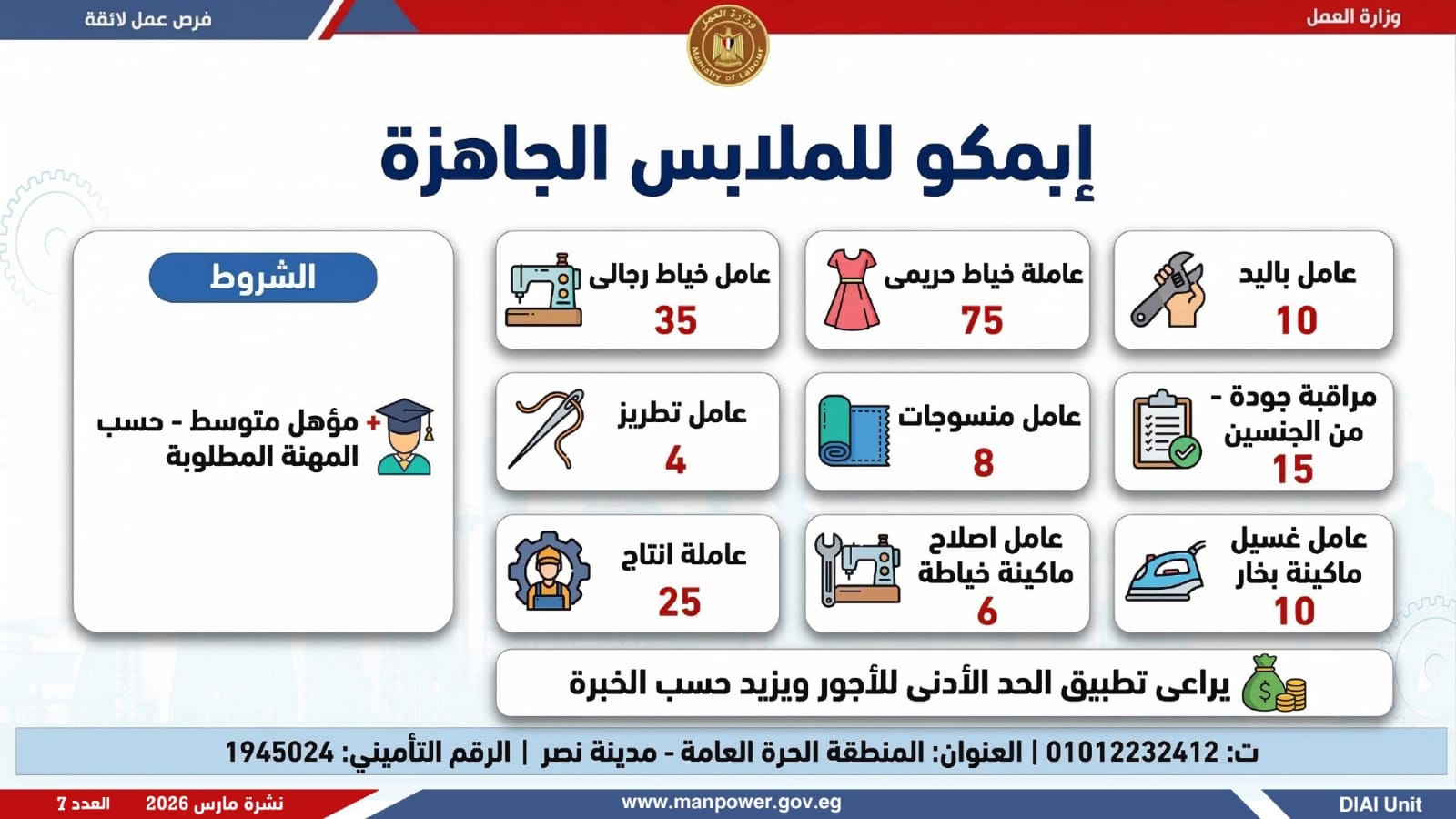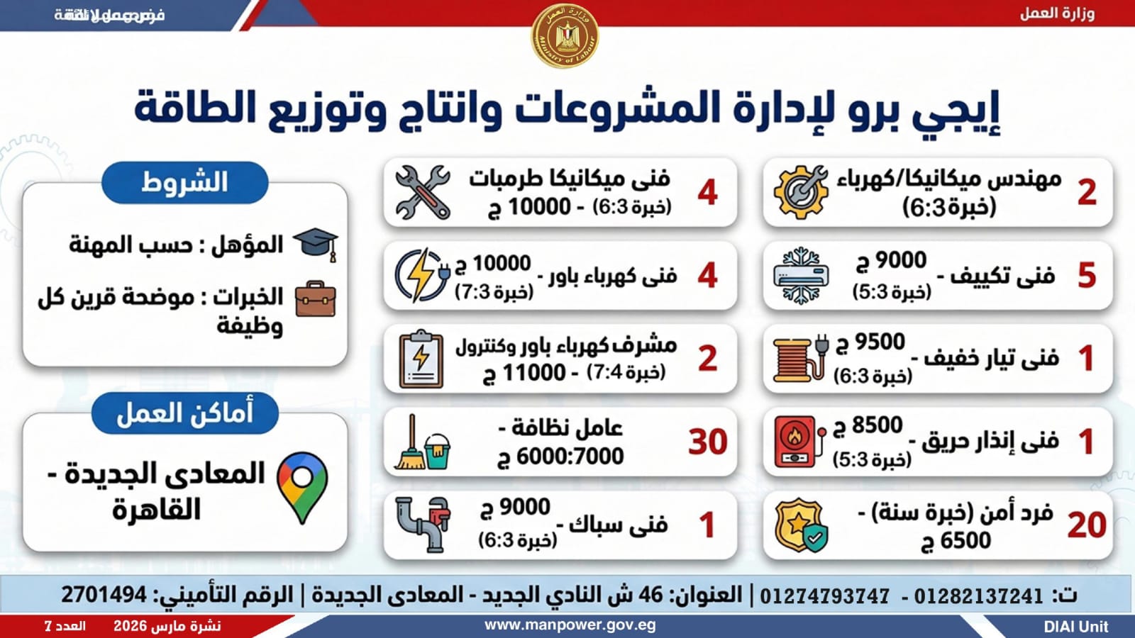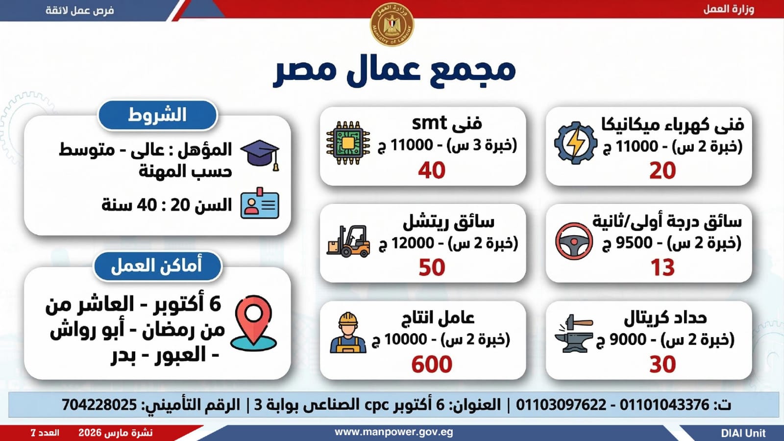 وفي بعدٍ رقابي، وجّه الوزير مديريات العمل بالمحافظات بتكثيف المتابعة الميدانية لضمان جدية الفرص المعلنة، والتأكد من التزام المنشآت بتطبيق الحد الأدنى للأجور، وتحري الدقة والمصداقية في نشر الوظائف، حتى استلام العامل لمهام عمله رسميًا، كما جدّد دعوته لشباب مصر للإقبال على العمل بالقطاع الخاص، مؤكدًا أن الدولة توفر برامج تدريب مهني مجانية تؤهل الشباب لوظائف المستقبل وفق احتياجات سوق العمل...وبيّنت الوزارة أن التقديم يتم عبر الإدارة العامة للتشغيل بمقر الوزارة القديم بمدينة نصر، أو من خلال مديريات العمل بالمحافظات، أو مباشرة عبر بيانات الشركات المرفقة بالنشرة، وكذلك من خلال الموقع الرسمي للوزارة، مشيرة إلى أن نشرة التوظيف تصدر بشكل أسبوعي، من خلال الإدارة العامة للتشغيل برئاسة هبة أحمد، وبإعداد منى شوقي – باحث أول بالإدارة، وتتضمن أحدث الفرص المتوفرة على مستوى الجمهورية، نتاج تعاون مشترك بين مديريات العمل والقطاع الخاص بالمحافظات.