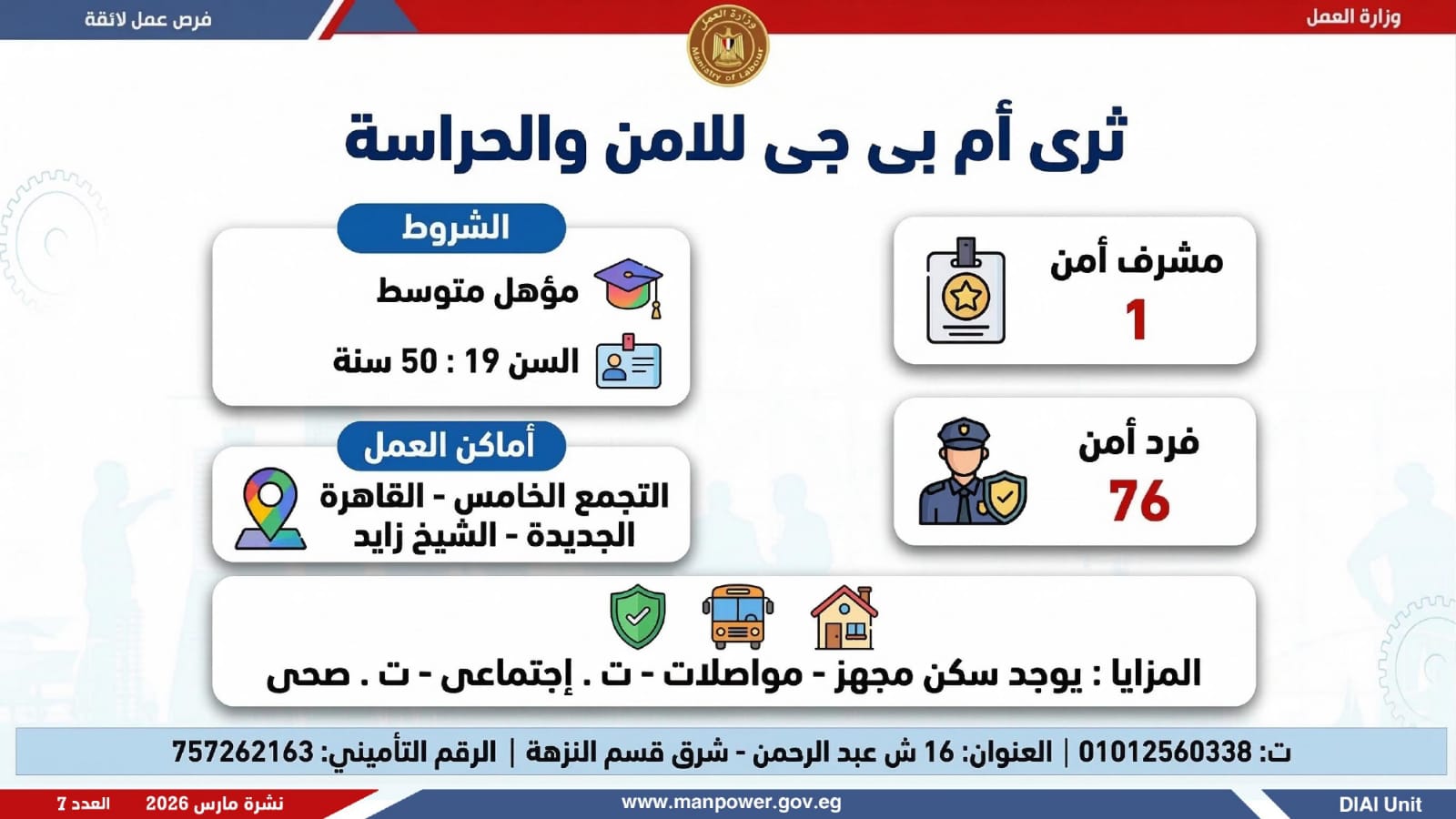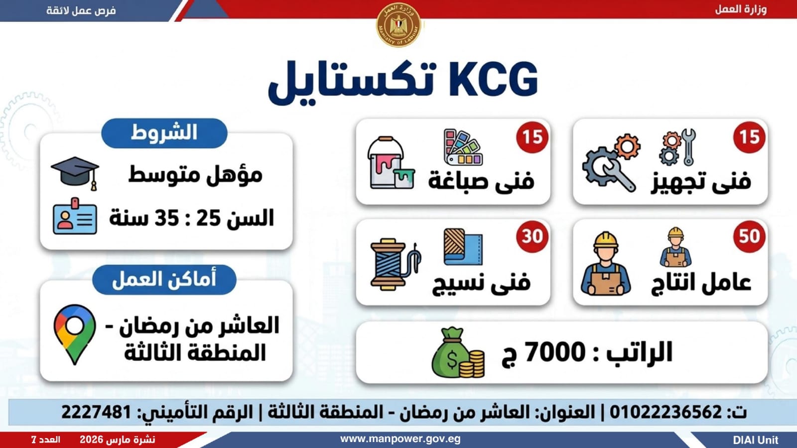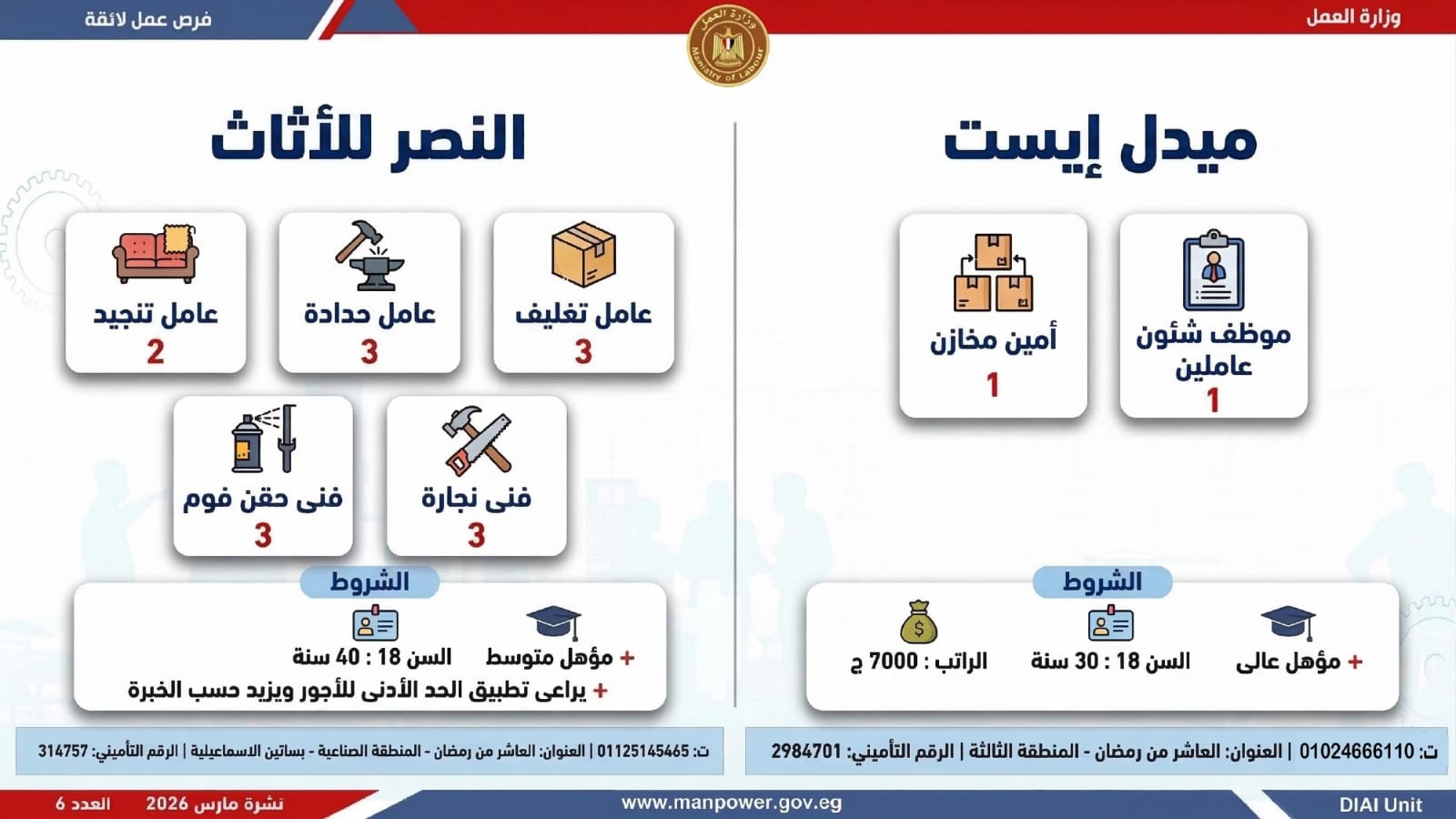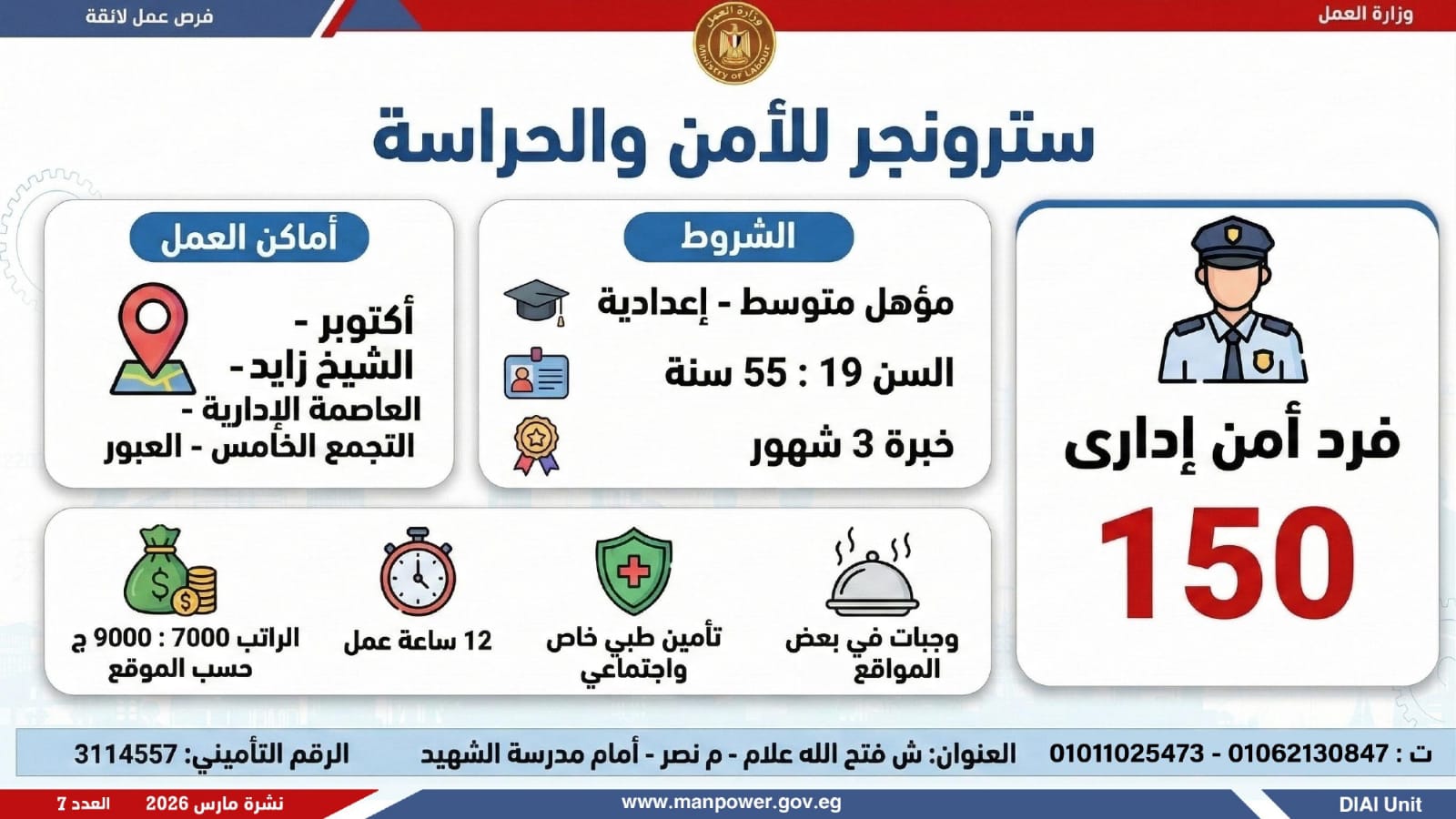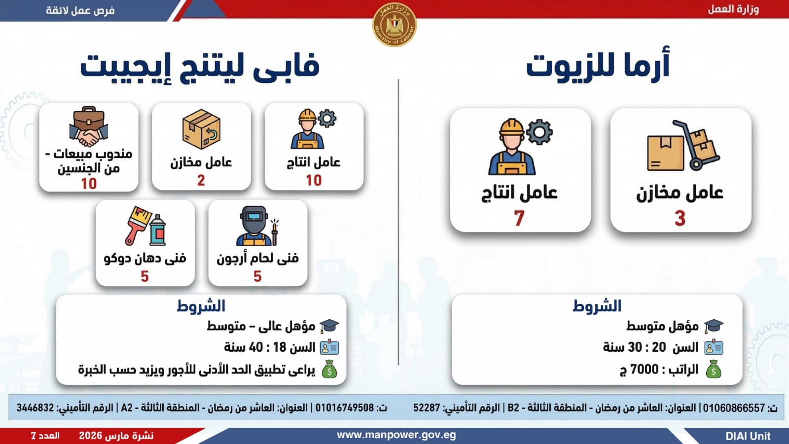 وفي بعدٍ رقابي، وجّه الوزير مديريات العمل بالمحافظات بتكثيف المتابعة الميدانية لضمان جدية الفرص المعلنة، والتأكد من التزام المنشآت بتطبيق الحد الأدنى للأجور، وتحري الدقة والمصداقية في نشر الوظائف، حتى استلام العامل لمهام عمله رسميًا، كما جدّد دعوته لشباب مصر للإقبال على العمل بالقطاع الخاص، مؤكدًا أن الدولة توفر برامج تدريب مهني مجانية تؤهل الشباب لوظائف المستقبل وفق احتياجات سوق العمل...وبيّنت الوزارة أن التقديم يتم عبر الإدارة العامة للتشغيل بمقر الوزارة القديم بمدينة نصر، أو من خلال مديريات العمل بالمحافظات، أو مباشرة عبر بيانات الشركات المرفقة بالنشرة، وكذلك من خلال الموقع الرسمي للوزارة، مشيرة إلى أن نشرة التوظيف تصدر بشكل أسبوعي، من خلال الإدارة العامة للتشغيل برئاسة هبة أحمد، وبإعداد منى شوقي – باحث أول بالإدارة، وتتضمن أحدث الفرص المتوفرة على مستوى الجمهورية، نتاج تعاون مشترك بين مديريات العمل والقطاع الخاص بالمحافظات.