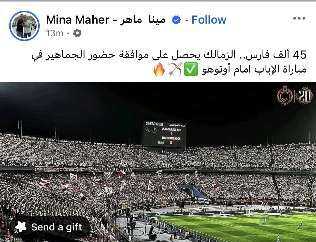 وكتب ماهر عبر حسابه الشخصي بموقع فيسبوك: “45 ألف فارس.. الزمالك يحصل على موافقة حضور الجماهير في مباراة الإياب امام أوتوهو”.