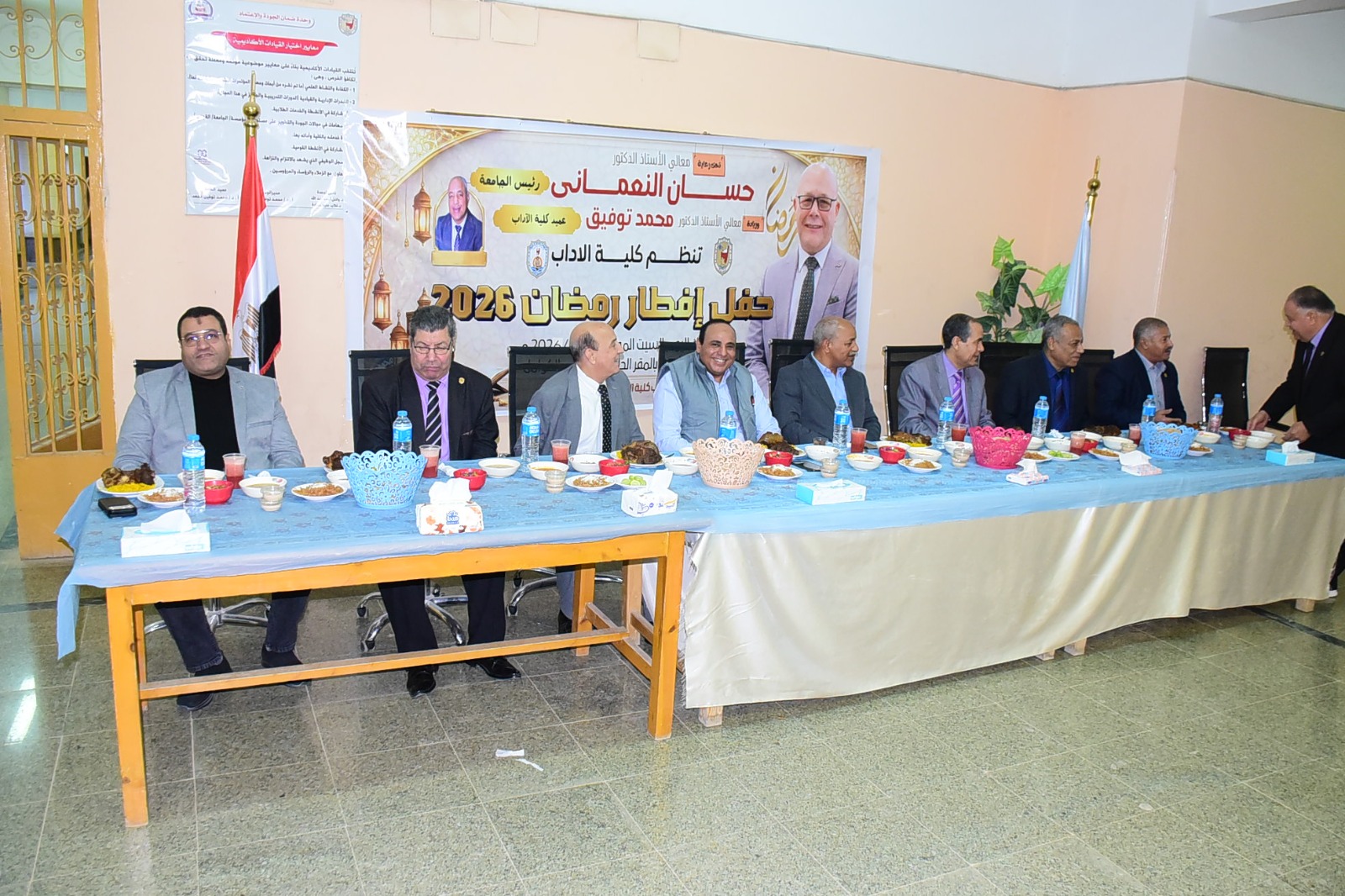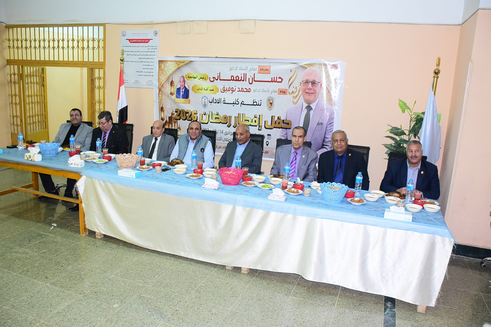 نظمت كلية الآداب افطارها الرمضاني السنوي، فى أجواء مليئة بالمودة والرحمة وممزوجة ببركة ونفحات الشهر الكريم العطرة، وذلك بحضورالدكتور خالد عمران نائب رئيس الجامعة لشئون خدمة المجتمع وتنمية البيئة والدكتور محمد توفيق عميد الكلية، ووكلاء الكلية ورؤساء الأقسام، وأعضاء الجهاز الإداري، وجمع غفير من الطلاب.