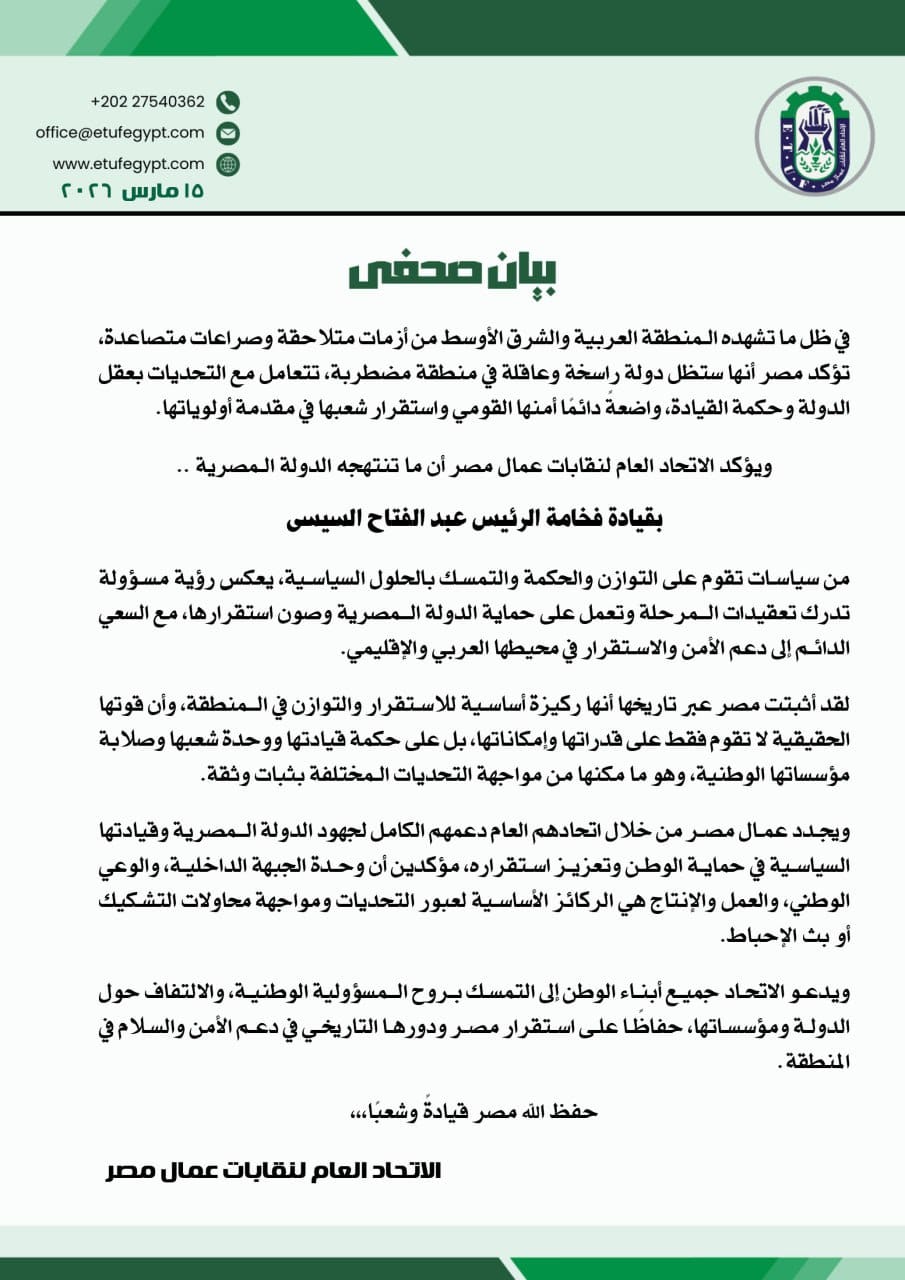 أكد الاتحاد العام لنقابات عمال مصر، أن مصر ستظل دولة راسخة ومتزنة في محيط إقليمي مضطرب، رغم ما تشهده المنطقة العربية والشرق الأوسط من أزمات متلاحقة وصراعات متصاعدة، مشددًا على أن الدولة المصرية تتعامل مع التحديات بعقل الدولة وحكمة القيادة، واضعةً أمنها القومي واستقرار شعبها في مقدمة أولوياتها.